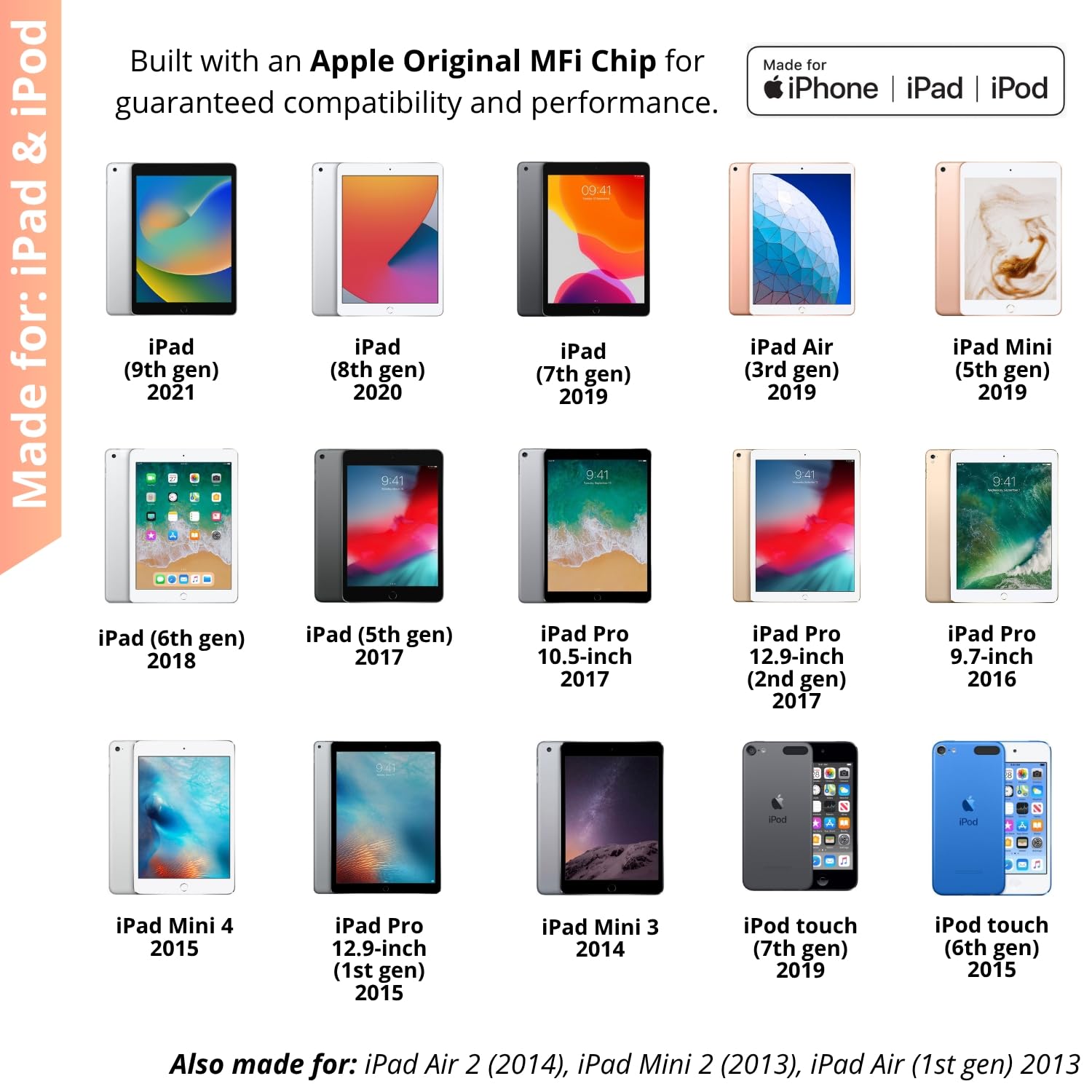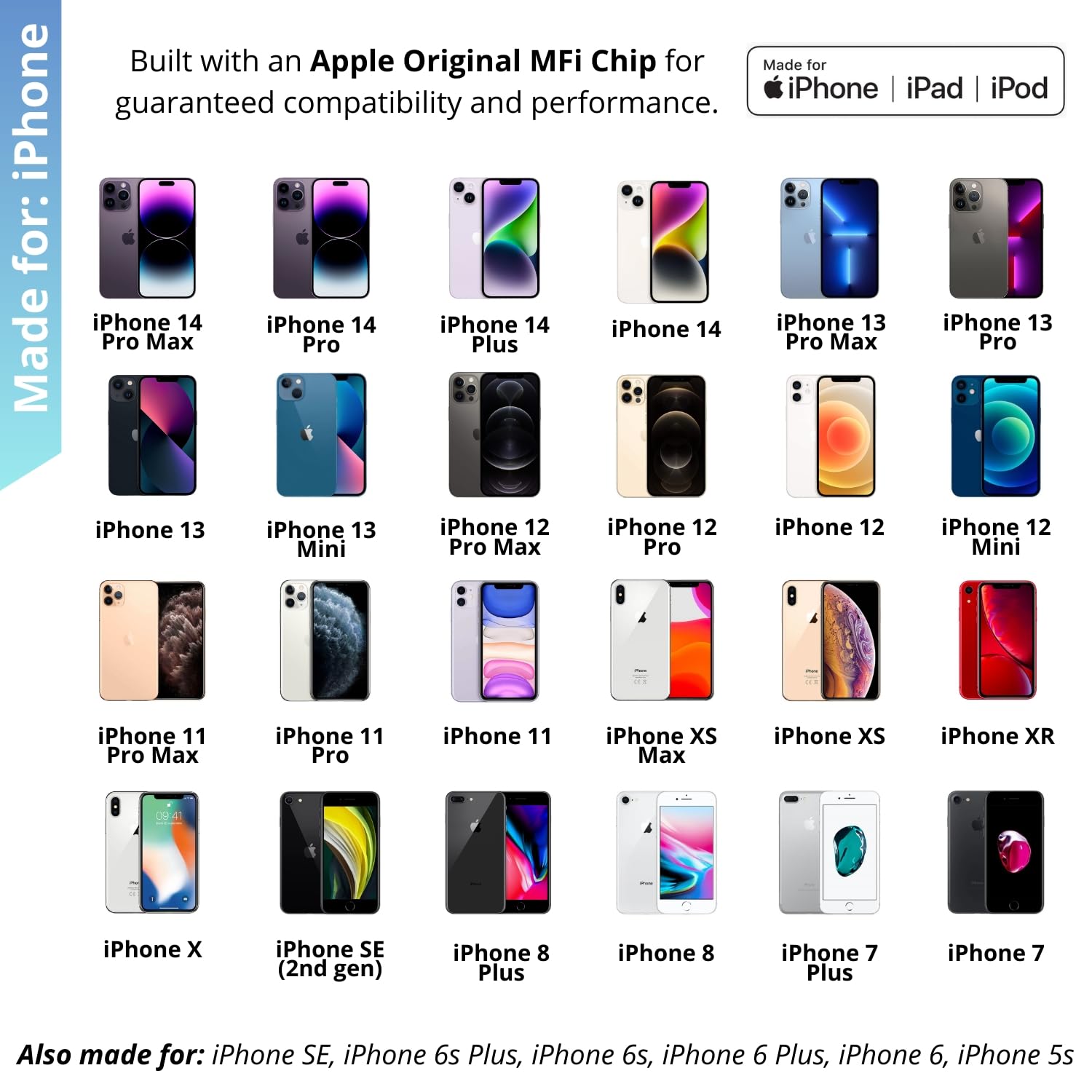 🎵 Compatibility List: iPhone 14, iPhone 14 Pro, iPhone 13, iPhone 13 Mini, iPhone 13 Pro, iPhone 13 Pro Max,iPhone 12, iPhone 12 Mini, iPhone 12 Pro, iPhone 12 Pro Max, iPhone 11, iPhone 11 Pro, iPhone 11 Pro Max, iPhone X, iPhone XS, iPhone XS Max, iPhone XR, iPhone 8, iPhone 8 Plus, iPhone 7, iPhone 7 Plus, iPad or iPod touch with lightning port