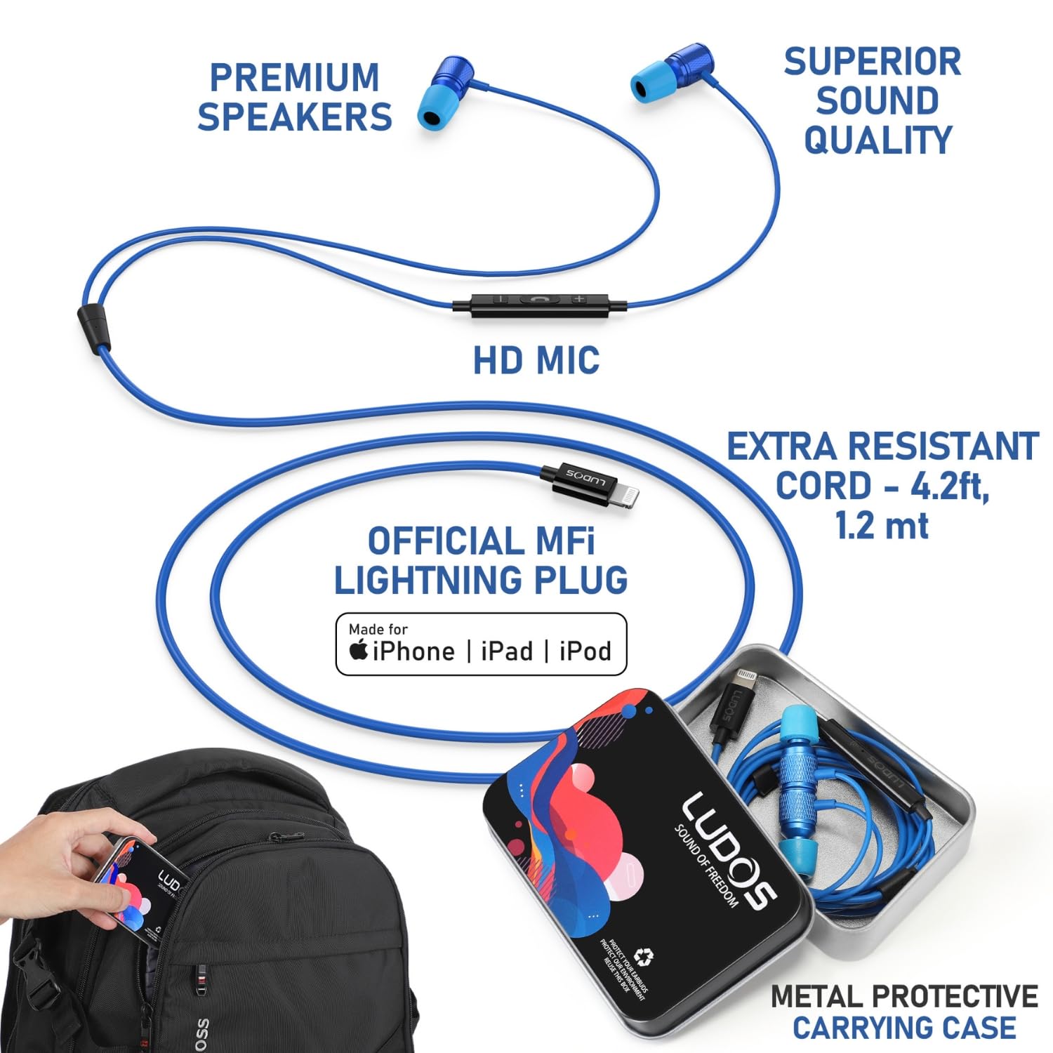 🎵 Strong: These lightning earbuds wired feature rock solid design and a extra long 4.2 ft cord (1.2 mt); iphone 14 headphones wired with mics are designed to be super tough and withstand the most demanding conditions; When you need lightning earbuds for performance, trust only LUDOS