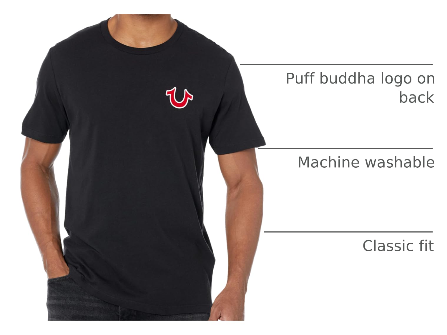 Description The True Religion Menβs Buddha Logo Crew Neck Tee Shirt is a wardrobe essential in t shirts for men, combining comfort, quality, and iconic style. Crafted from 100% cotton, this tee is lightweight, soft, and durable. With a classic crew neck and short sleeves, it offers a reliable fit that works for every occasion. Featuring a horseshoe chest logo and bold Buddha back graphic, it delivers distinctive style compared to ordinary graphic tees for men. Perfect as an everyday essential, this tee pairs effortlessly with jeans, joggers, or layered under a jacket. True Religion is known for mens t-shirts that balance durability and standout design, and this one is no exception. Available in multiple colors and all sizes, itβs built to be worn on repeat.