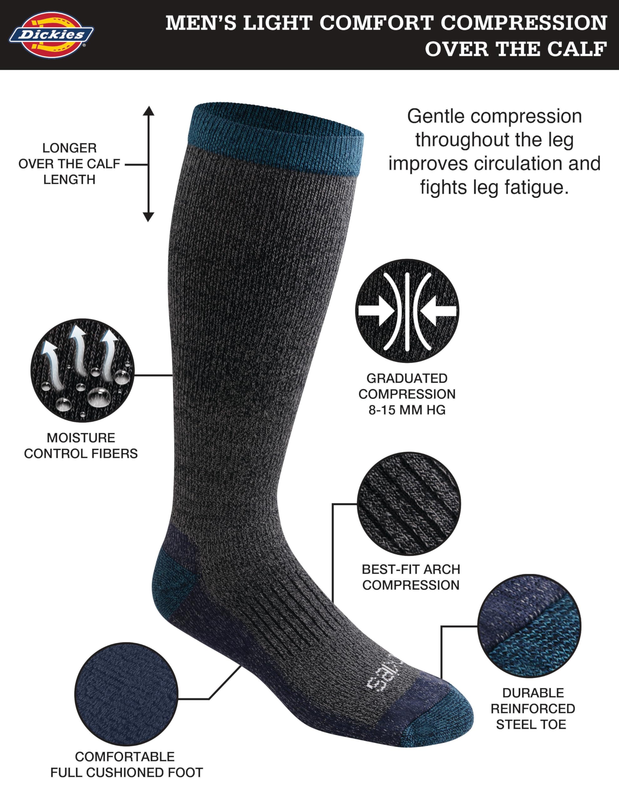 Description Dickies light weight comfort compression socks for men circulation is engineered with gentle mild compression throughout the leg to improve circulation and fight leg fatigue. Compression socks are not too tight or hard to get it on and fit well, these socks are mild compression grade between 8~15mmHg. Over the calf compression socks constructed with moisture control fibers, compression sock help improve performance, fast recovery, increase blood circulation and reduce fatigue. Perfect for long flight travel, long hour shifts, teachers, and seniors. For Over 95 Years Dickies has been making hard-duty work products built to stand up to whatever life throws at you. Dickies Work Socks are built with purpose to deliver superior comfort and performance on and off the job.