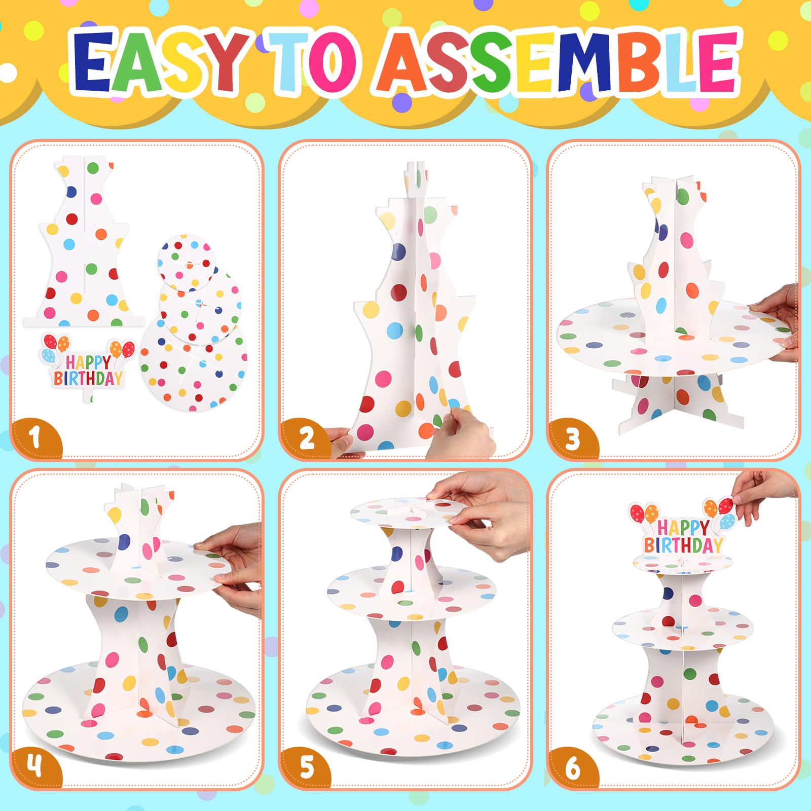 Easy to Assemble: You can assemble the birthday dessert tower stand without any tools; You just need to slide the small base with the top slit into the larger base with bottom slit and open, then build your stand, take the largest circle and slide down to the bottom notch, repeat with midsize circle and end with the smallest circle