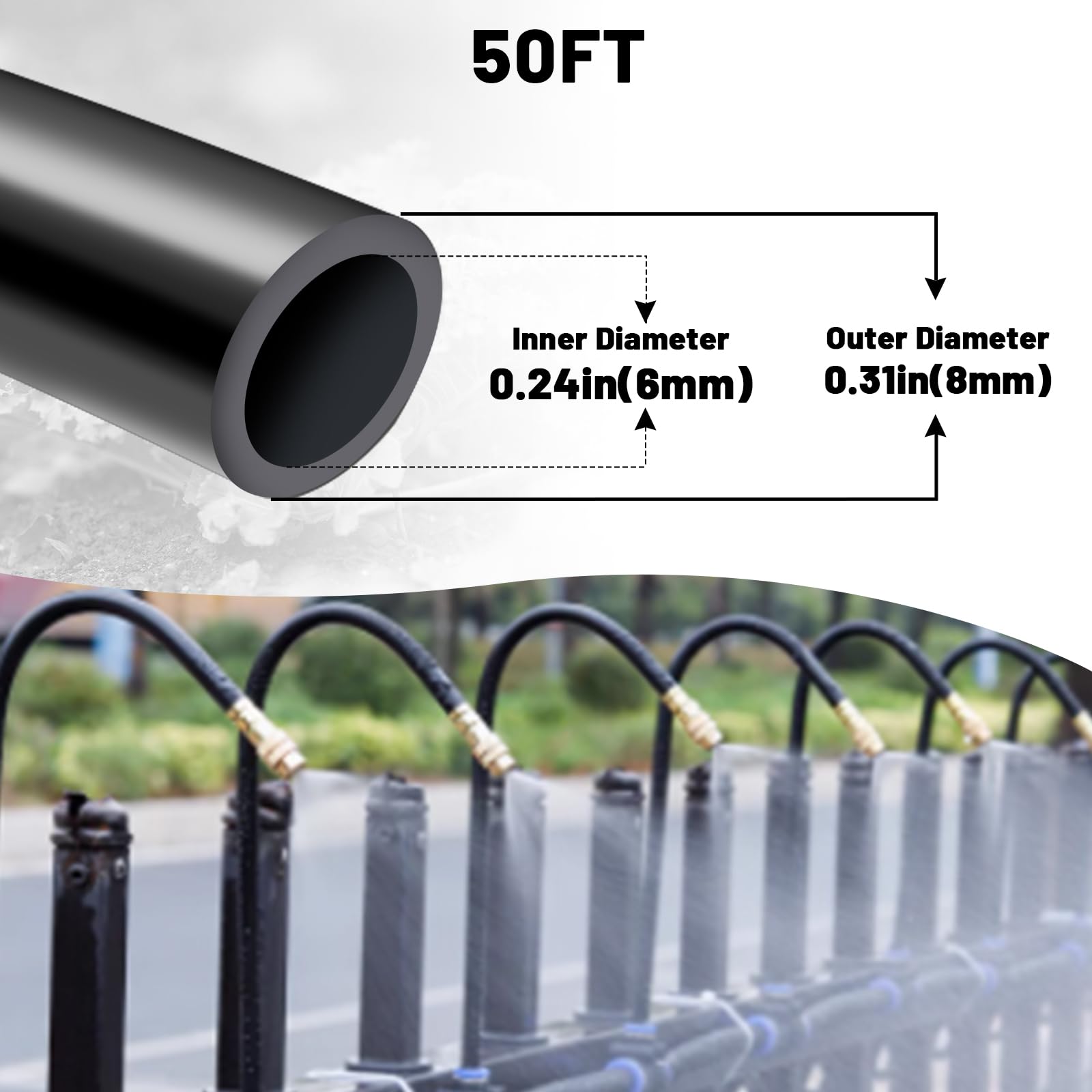 Suitable for 360° Irrigation System: The tubing has an outer diameter of 8mm (0.31 inch) and an inner diameter of 6mm (0.24 inch), with a length of 50 ft. It can be connected to all standard 5/16 inch drip irrigation fittings to provide continuous and efficient water supply for plants