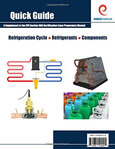 The Esco Institute Quick Guide to the Refrigeration Cycle, Refrigerants, and Components is intended to provide industry personnel with a review/refresher of fundamental concepts needed to be successful on the EPA Section 608 examination. This book will provide an overview of the following: -concepts and measurements of pressure as well as the related gas laws. -temperature/pressure relationship as it relates to the refrigeration cycle. -study of thermodynamics and heat transfer. -the refrigerant cycle, refrigerant states, and temperature/pressure relationships. -refrigerant composition, properties, and refrigerant applications. -common oils used with refrigerants, their applications and uses, and safe handling. -the process of retrofitting a system to use an alternative refrigerant and oil as well as system cleanup. -the function and applications of evaporators, condensers, compressors, and metering devices. -typical operating conditions for system components under normal conditions. -proper installation and maintenance of the refrigerant circuit components.(This book is a supplement and is not a stand alone study guide for the 608 exam. Please refer to the EPA Section 608 Preparatory Manual for a detailed study guide for the 608 Certification examination. )