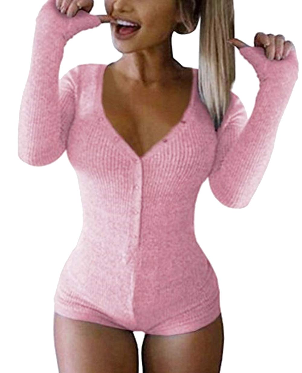 FEATURES:Sexy rompers jumpsuit pajamas,deep V neck, solid color,Button down closure,long sleeve one piece pajamas for women, unique butt flap design.