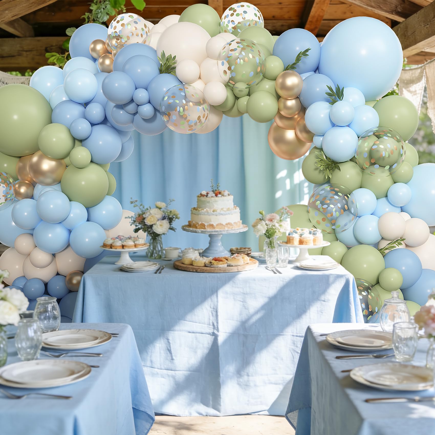 Sufficient Quantity Blue and Green Balloons: The green balloons includes 18" dusty blue/sage green/pastel blue balloons(3 pcs), 12" dusty blue/sage green/pastel blue/sand white/metallic gold/confetti balloons(30 pcs), 10" dusty blue/sage green/pastel blue/sand white/metallic gold balloons(56 pcs), 5" dusty blue/sage green/pastel blue/sand white/metallic gold balloons (54 pcs), 10 pcs balloon tools(flower balloon clips, hooks, balloon arch strip, tying tool, glue points, ribbon)