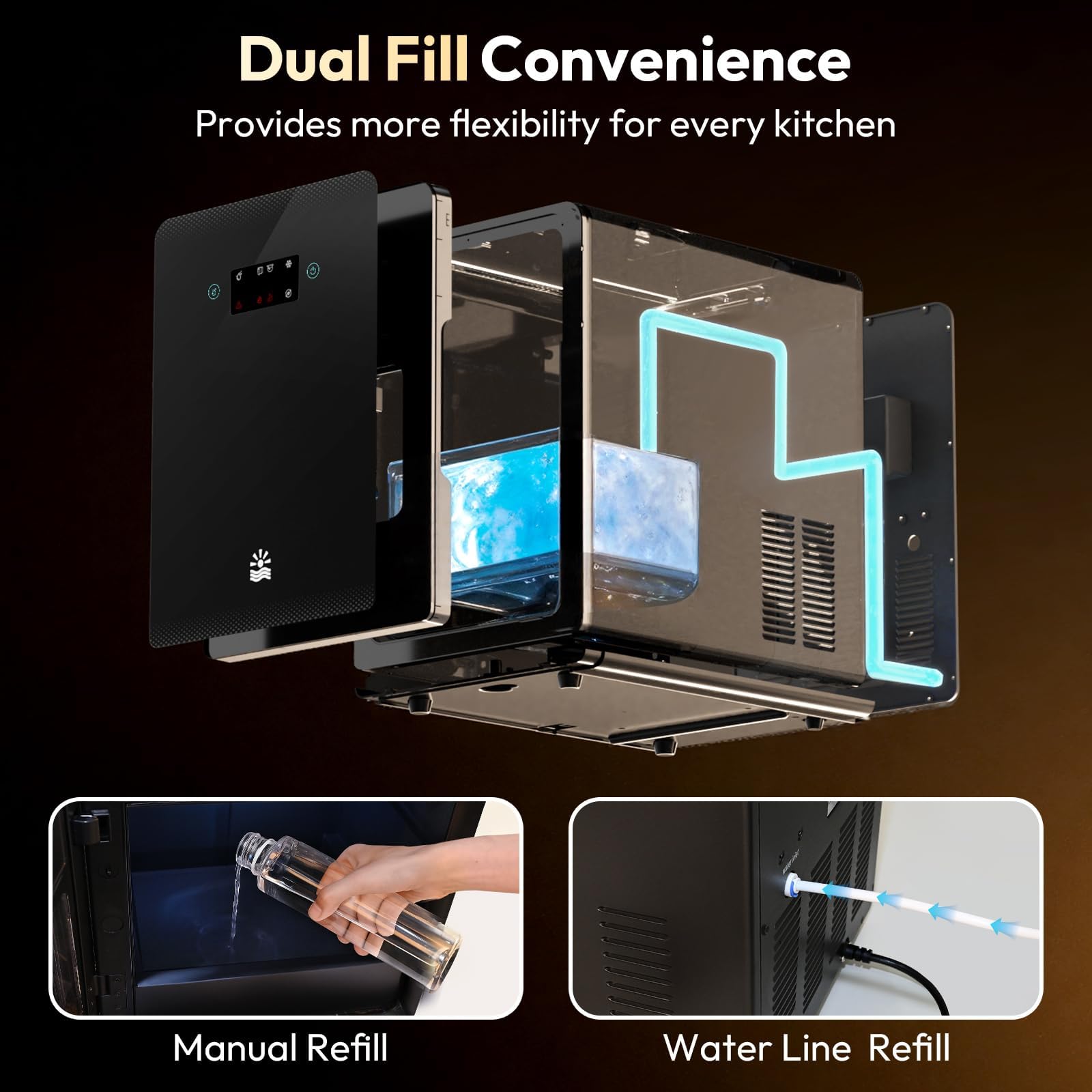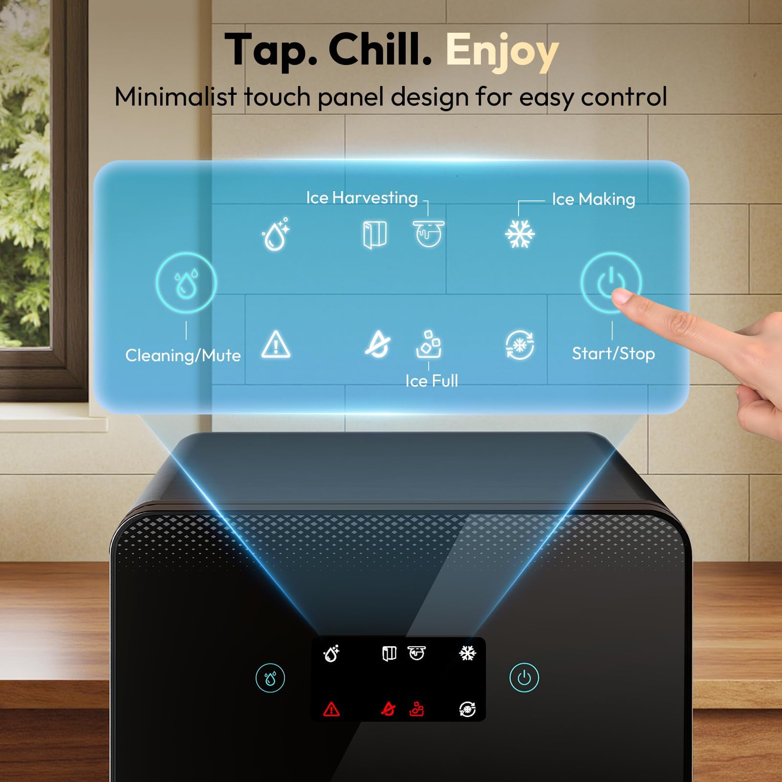 【INTUITIVE LCD TOUCH CONTROL】– Designed for effortless operation, the sleek LCD panel of the ice machine puts full control at your fingertips, while intuitive indicator lights keep you informed about water levels and ice production. A built-in door light makes late-night ice retrieval easy—modern comfort, redefined.