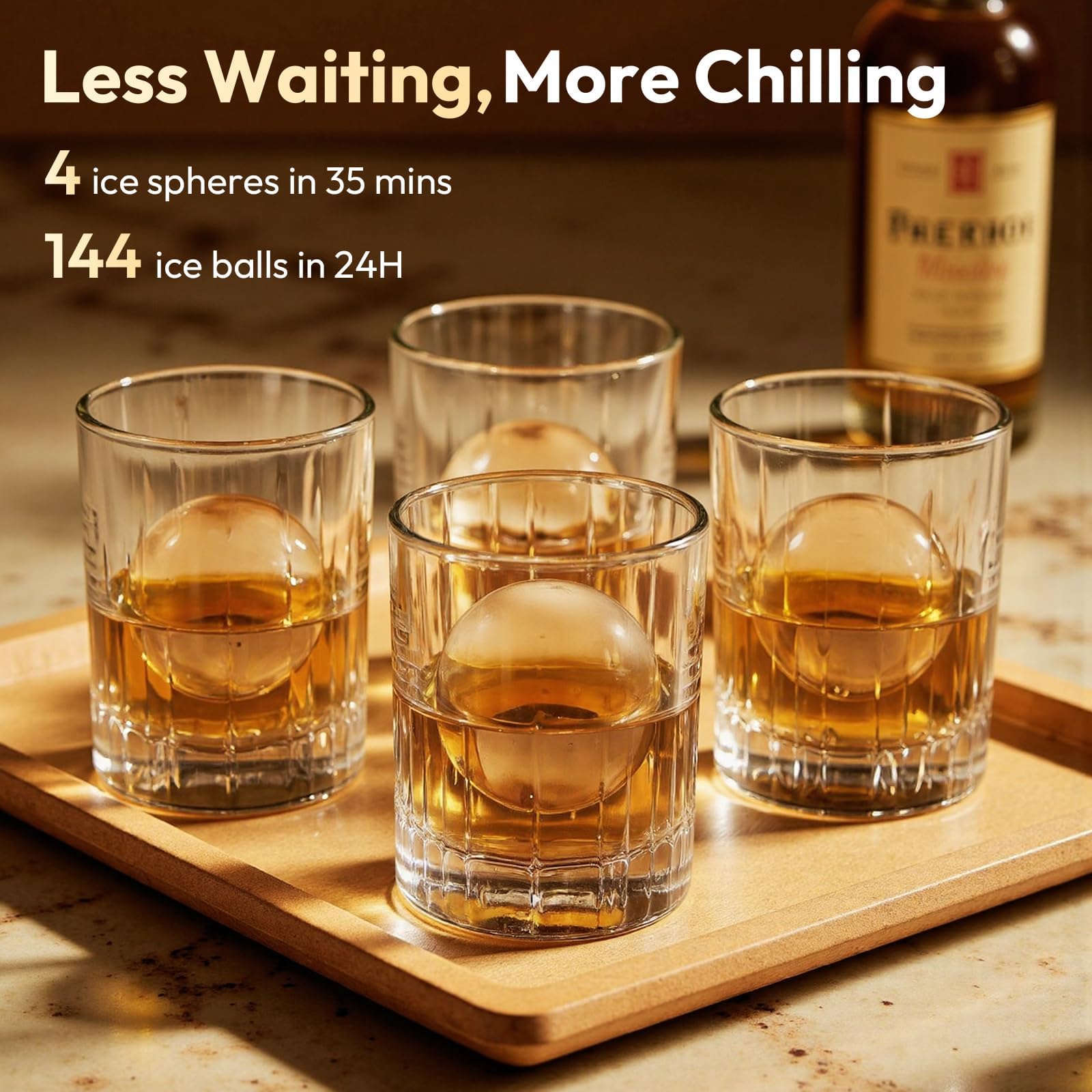 【ULTRA-FAST ICE BALL PRODUCTION】– Forget waiting overnight. With Oylus ice ball maker, enjoy 4 crystal-clear, slow-melting ice balls in just 35 minutes. Producing up to 144 premium ice spheres per day, it's up to 6X faster than traditional molds—perfect for parties, bourbon, cocktails, or whiskey nights.