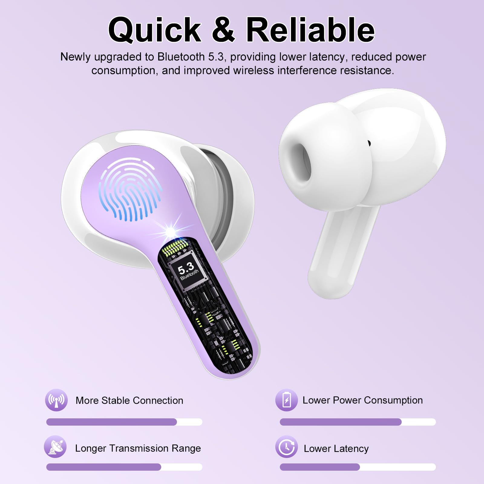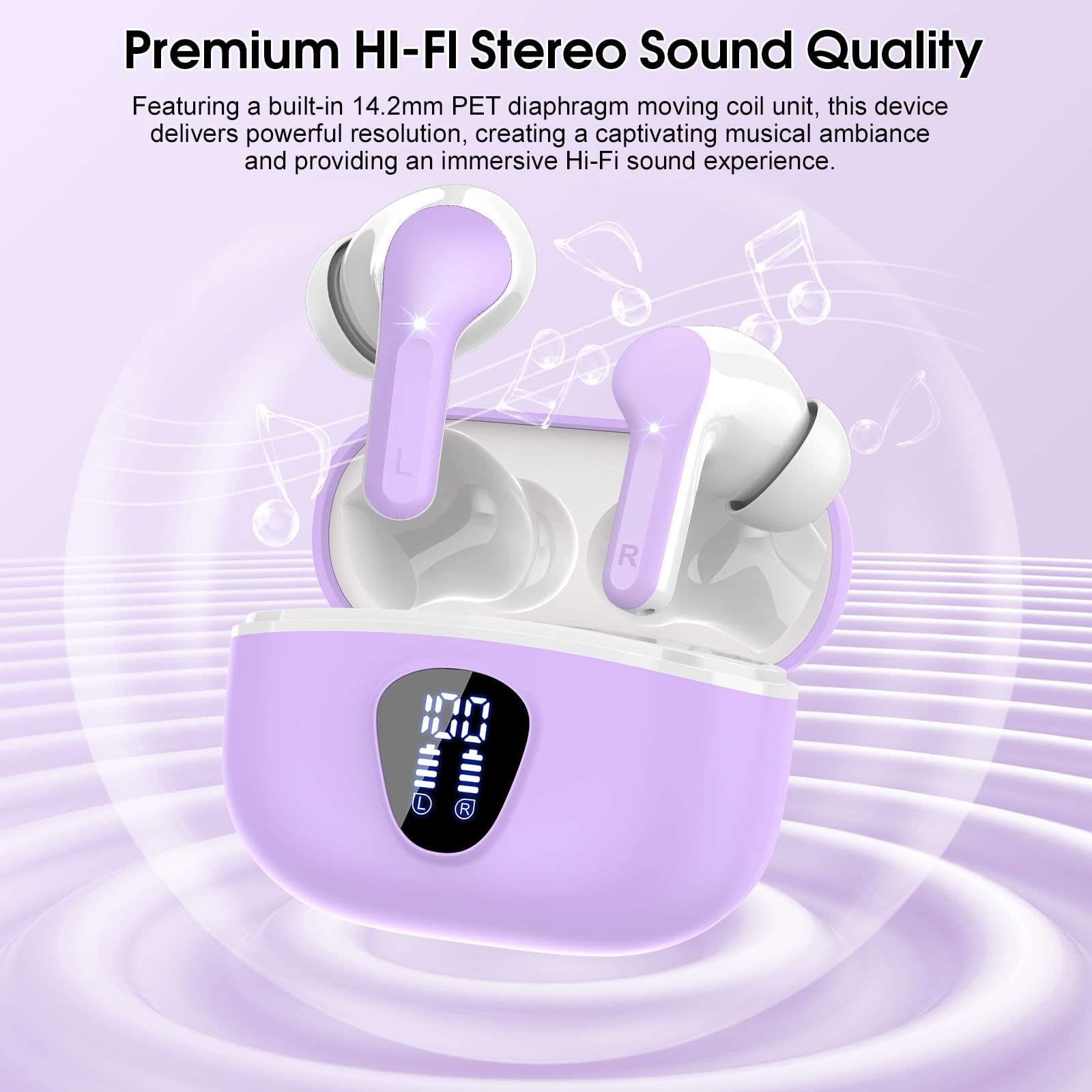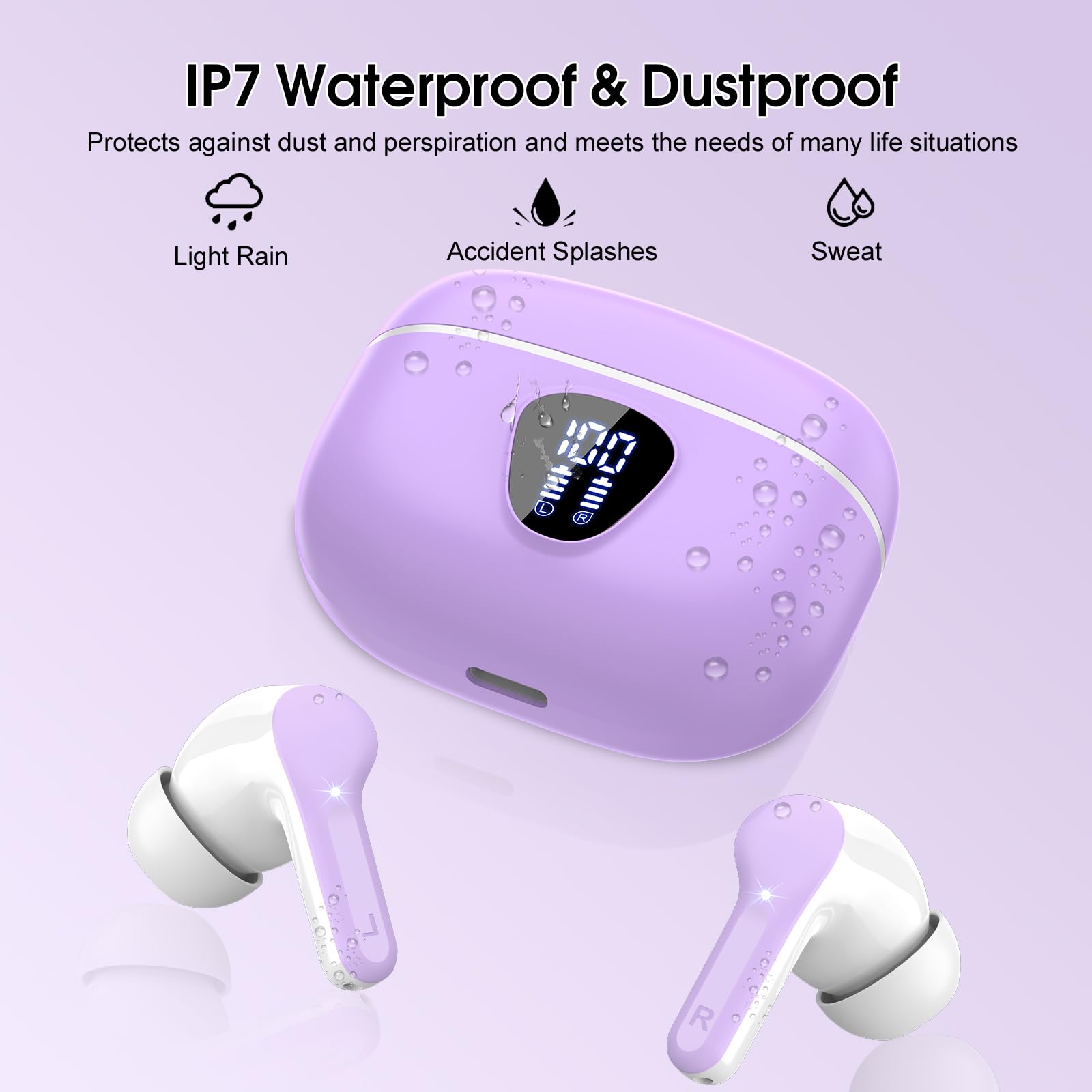 Wireless Earbuds, Bluetooth 5.4 Headphones HiFi Stereo, Bluetooth Earbuds with ENC Noise Cancelling Mic, IP7 Waterproof in Ear Earphones, 48H, LED Display Ear buds for Pad Workout Sports, Purple