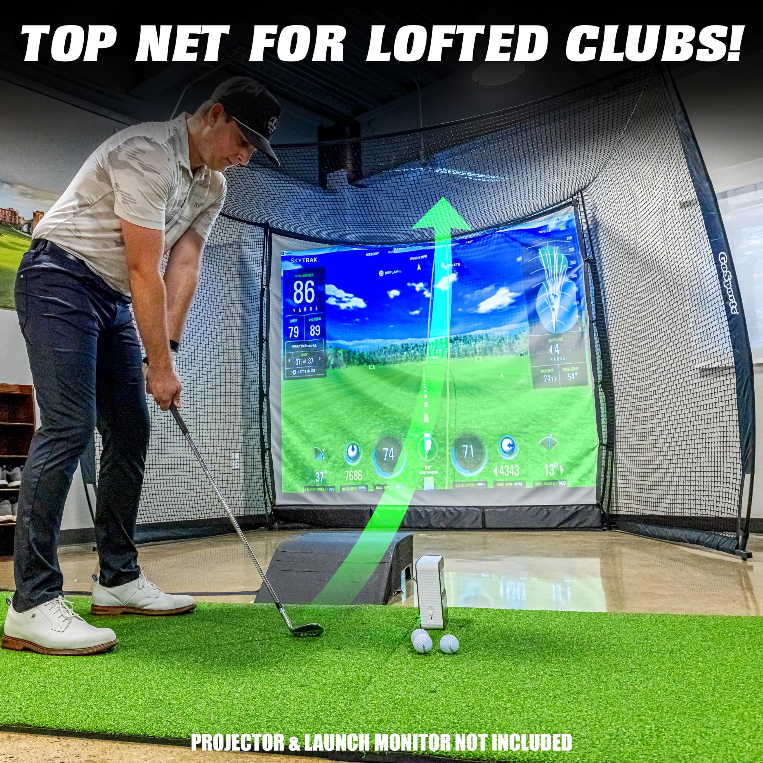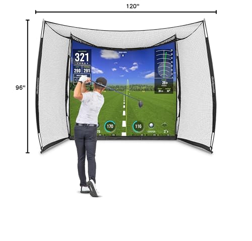 RANGE CAGE: Practice with confidence with real golf balls; Cage design provides built-in shank nets on each side & protective netting on top; Features a high density woven polyester blank simulator screen for use with golf simulators and projectors (not included)