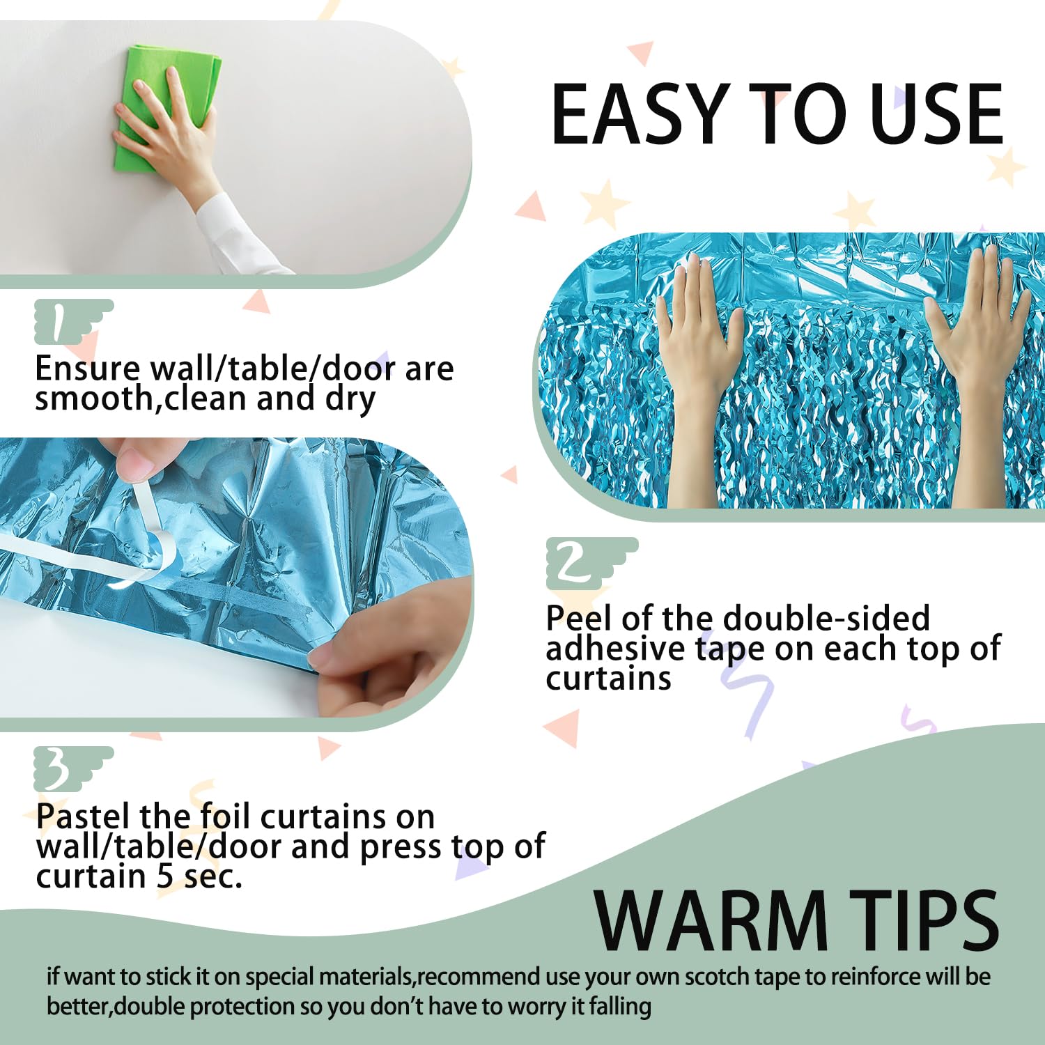 Package Included: 3 packs blue fringe curtain, the size of 3.3*6.6ft,It's long enough to fit any occasion,Please do not stick the foil curtain on uneven or stained walls to prevent it from falling off!!!