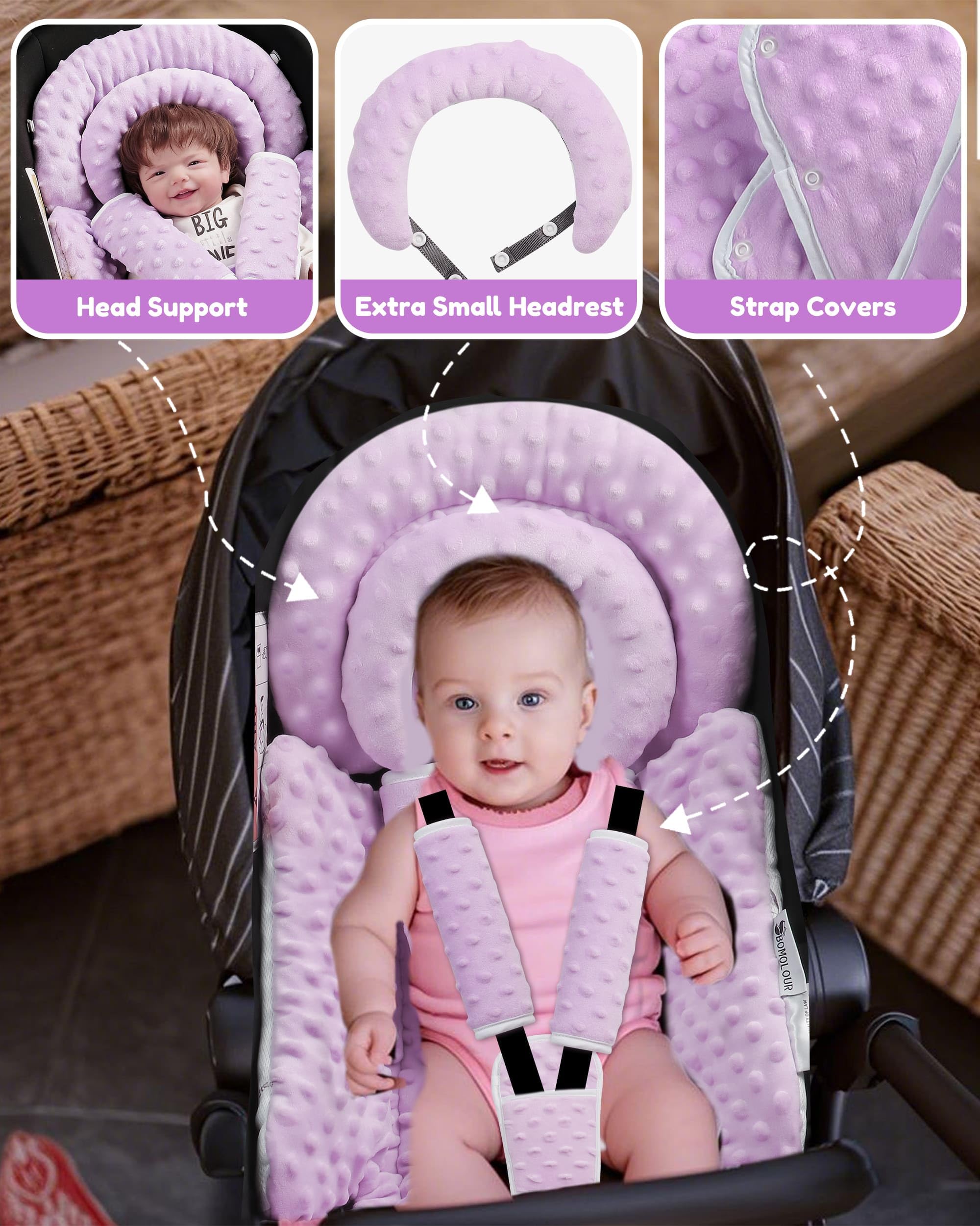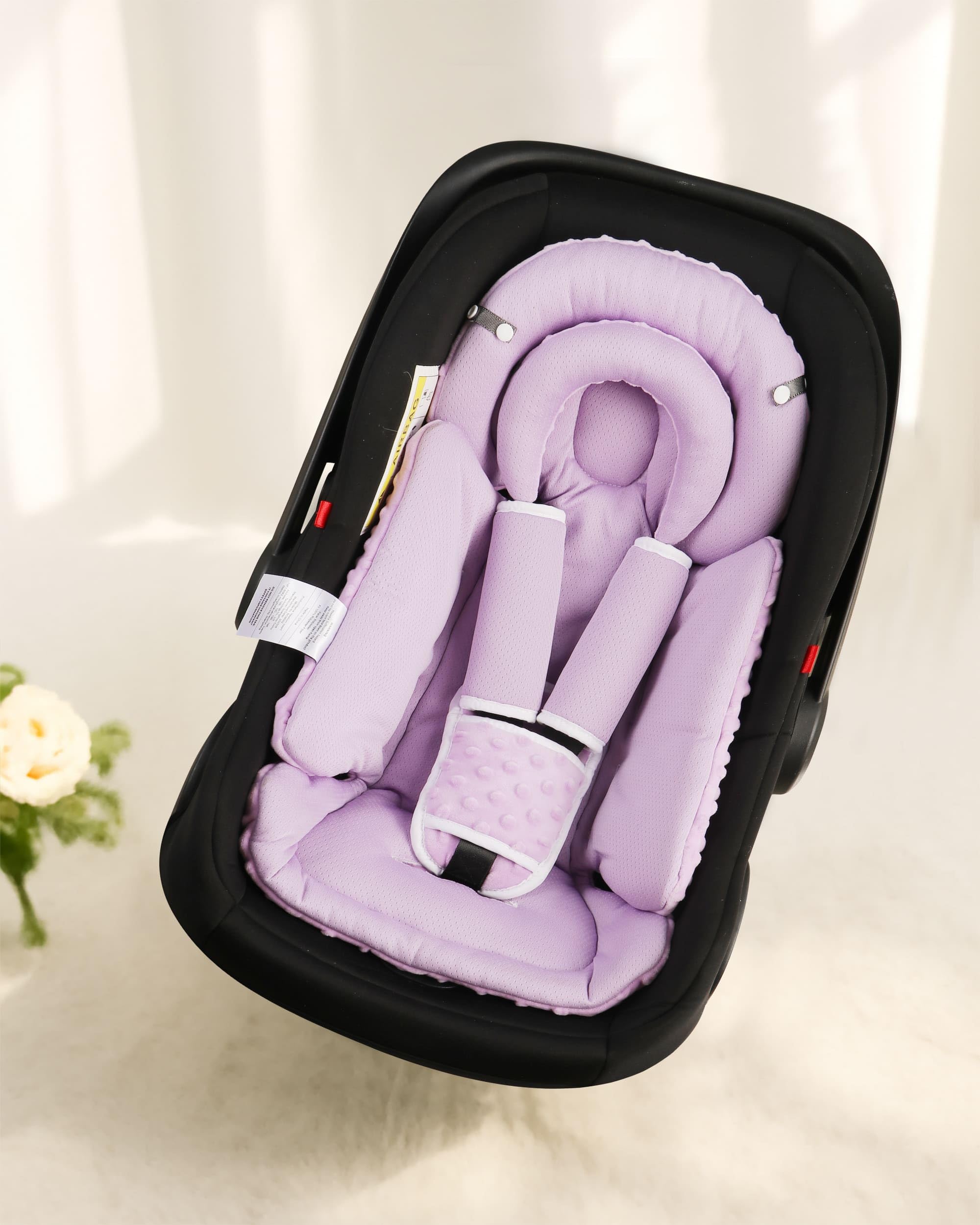 Full head support for babies 0-12 months: Removable crescent head cushion + thick padding adapts from preemie to toddlers. Full head support prevents head shaking (0-3M); remove cushion for older babies (3-12M). Fluffy body support padding makes baby more comfortable in infant car seats, baby strollers, or swings and rockers, baby bouncers, bassinets. No more buying multiple inserts