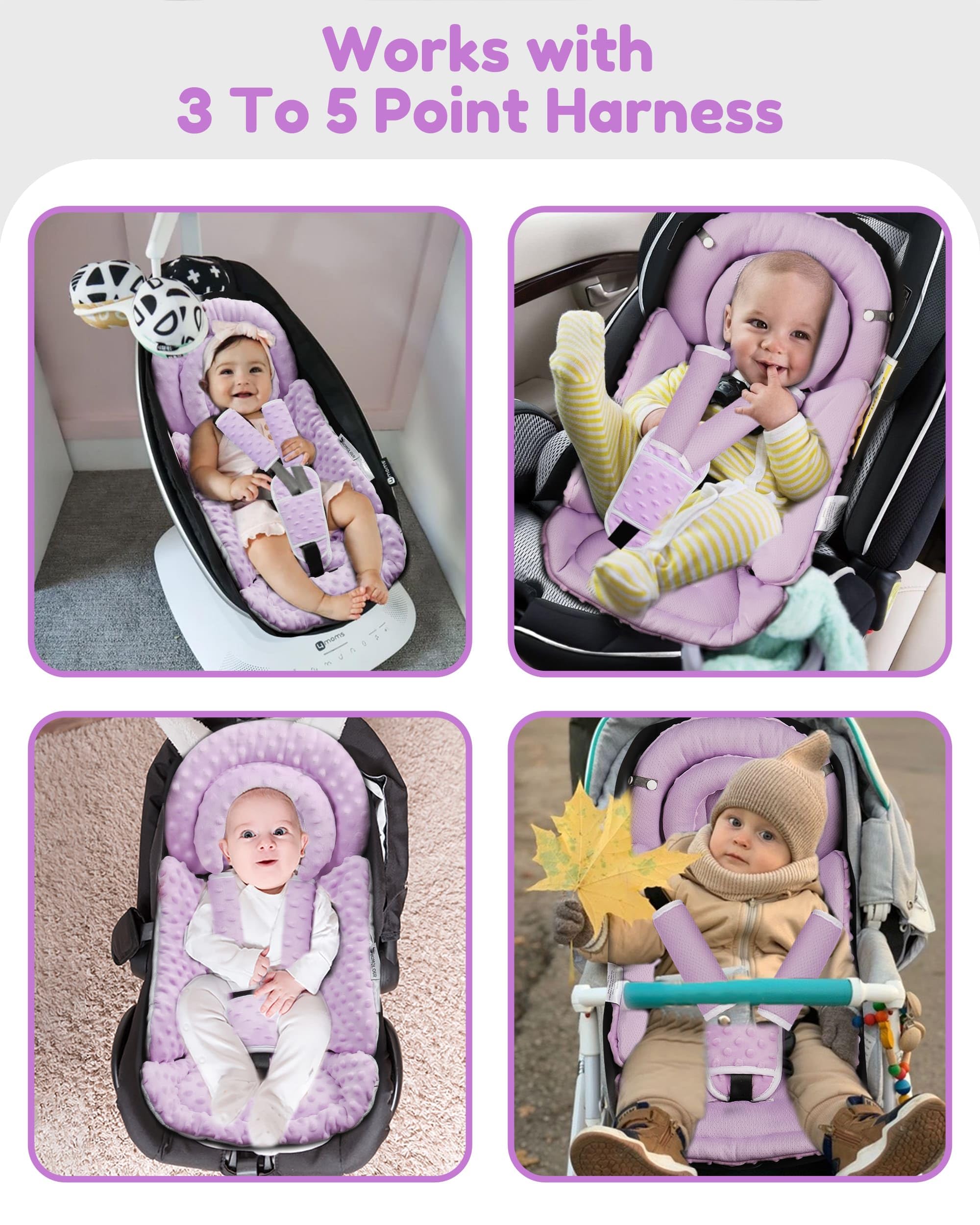 Universal Fit & Extra Safety: The infant insert compatible with Graco, Doona, Nuna, Chicco, 4moms Mamaroo, Uppababy, and most brands infant car seats. Includes 2 padded strap covers and 1 buckle cover to protect baby’s shoulder and belly from strap rubbing, ensuring baby's safety and comforty