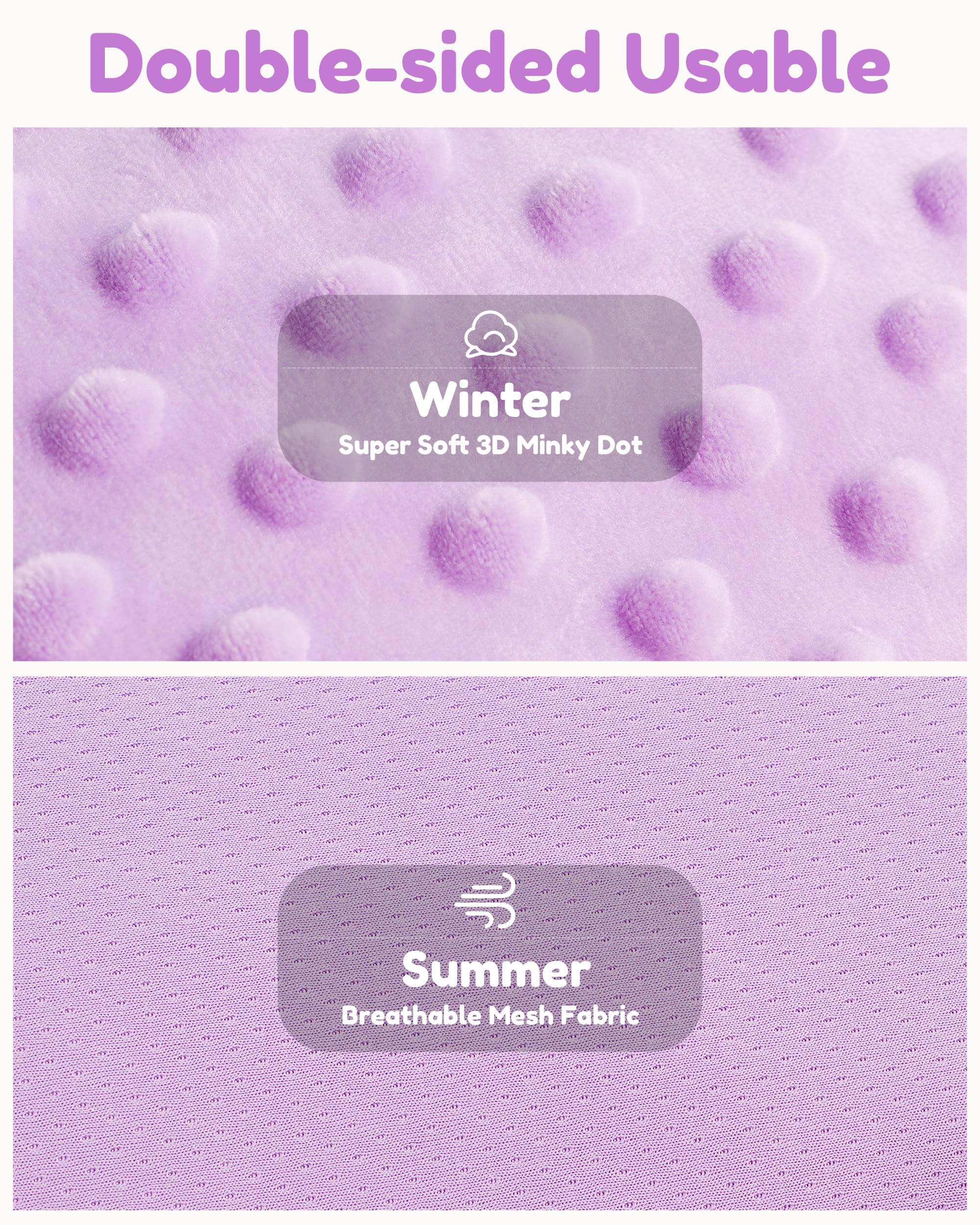 Double-Sided, Comfort for ALL Seasons: Soft Minky Dotted Plush fabric on front side (cozy for winter) + breathable mesh fabric on back side (cool for summer). Adorable prints stimulate sensory development. Gentle on skin and perfect for road trips, park walks, or indoor rocker