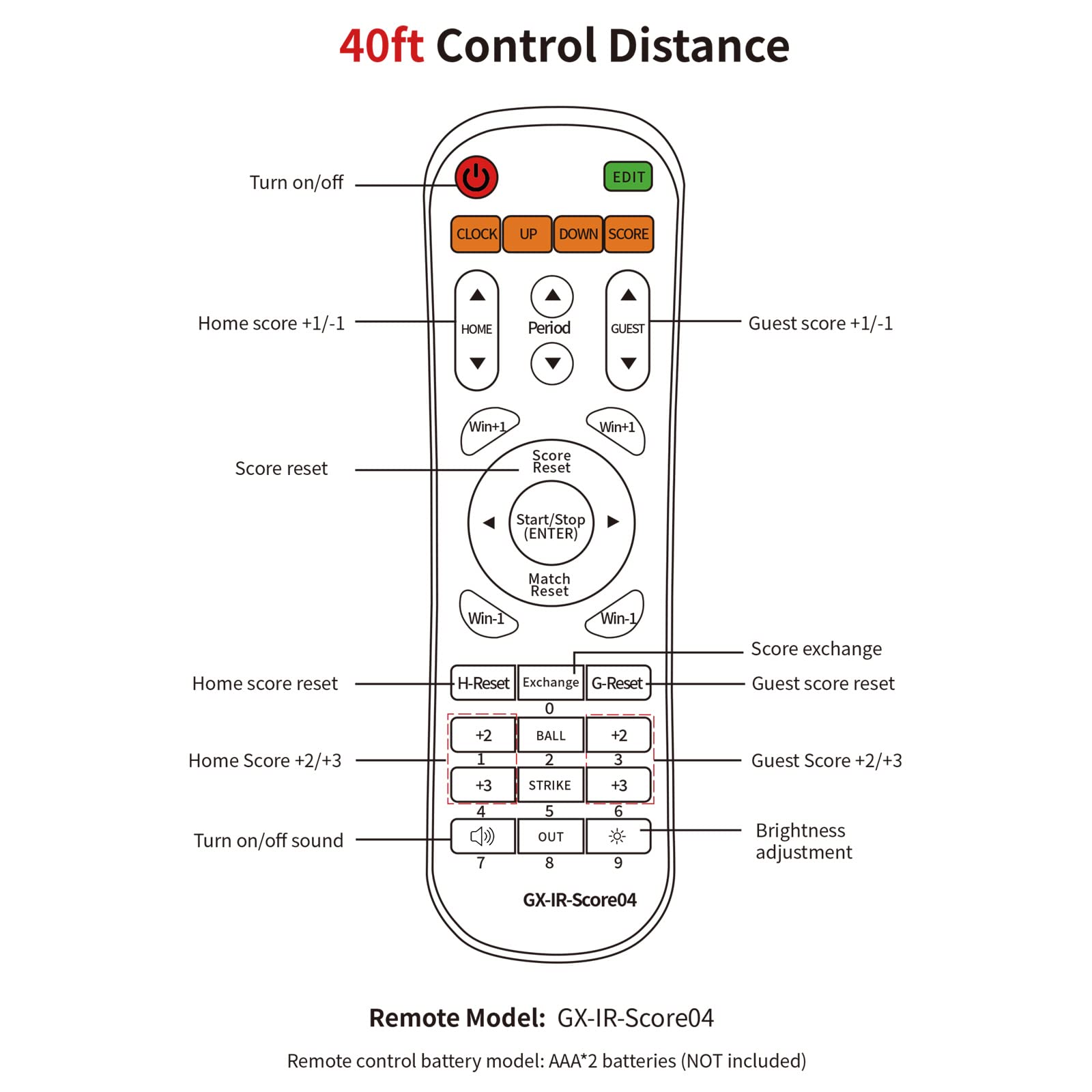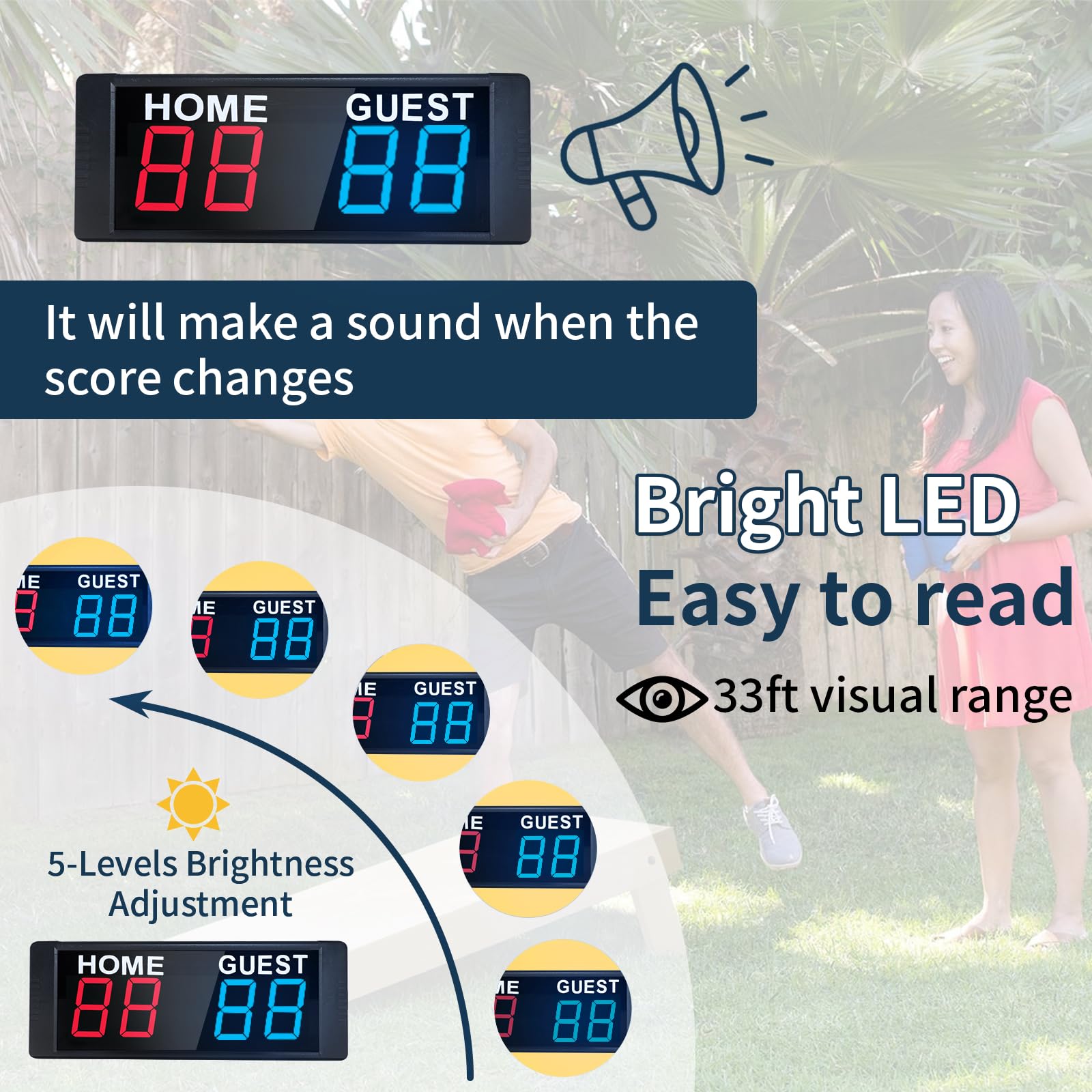 🥇【Easy Operation with Remote】Our scoreboards can keep scores from 1 to 99 with HOME GUEST sign. The scores of HOME&GUEST can be reset and exchanged. It will make a sound when the score changes(can be disabled), 5-levels brightness adjustment, all functions can be operated easily with remote control. 40ft remote control distance, perfectly meeting the needs of indoor or outdoor games.