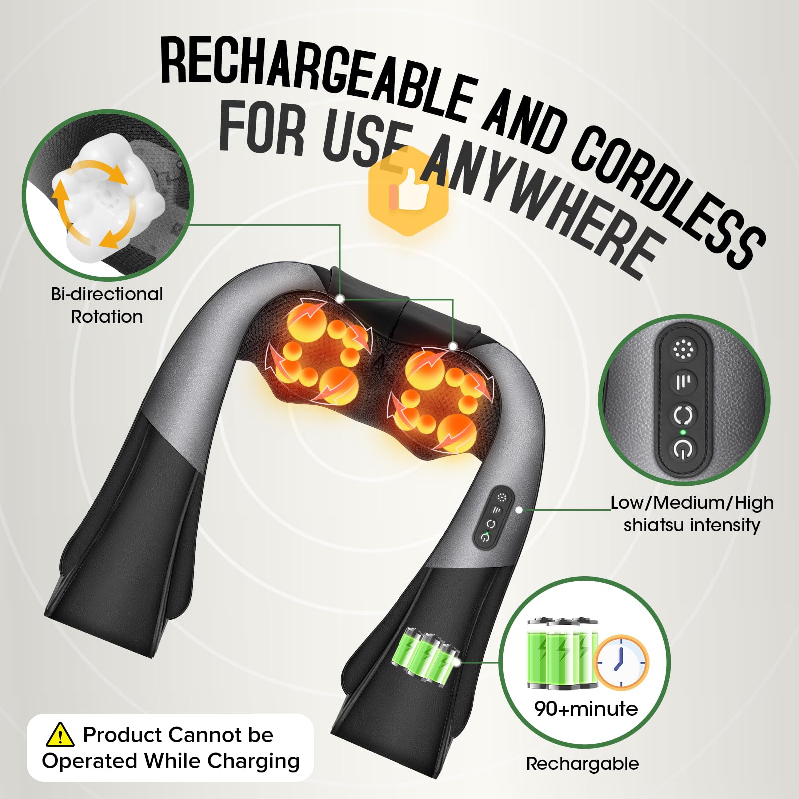 New Wireless Design:The neck massager has a built-in high-performance battery, so you can say goodbye to the trouble of wires and enjoy instant comfort by simply pressing the power button anywhere. This neck massager comes with a unique flexible shoulder strap that is easy to adjust to ensure a perfect fit for everyone. It also has an overheat protection function and a 15-minute automatic shutdown function, allowing you to use it without worries