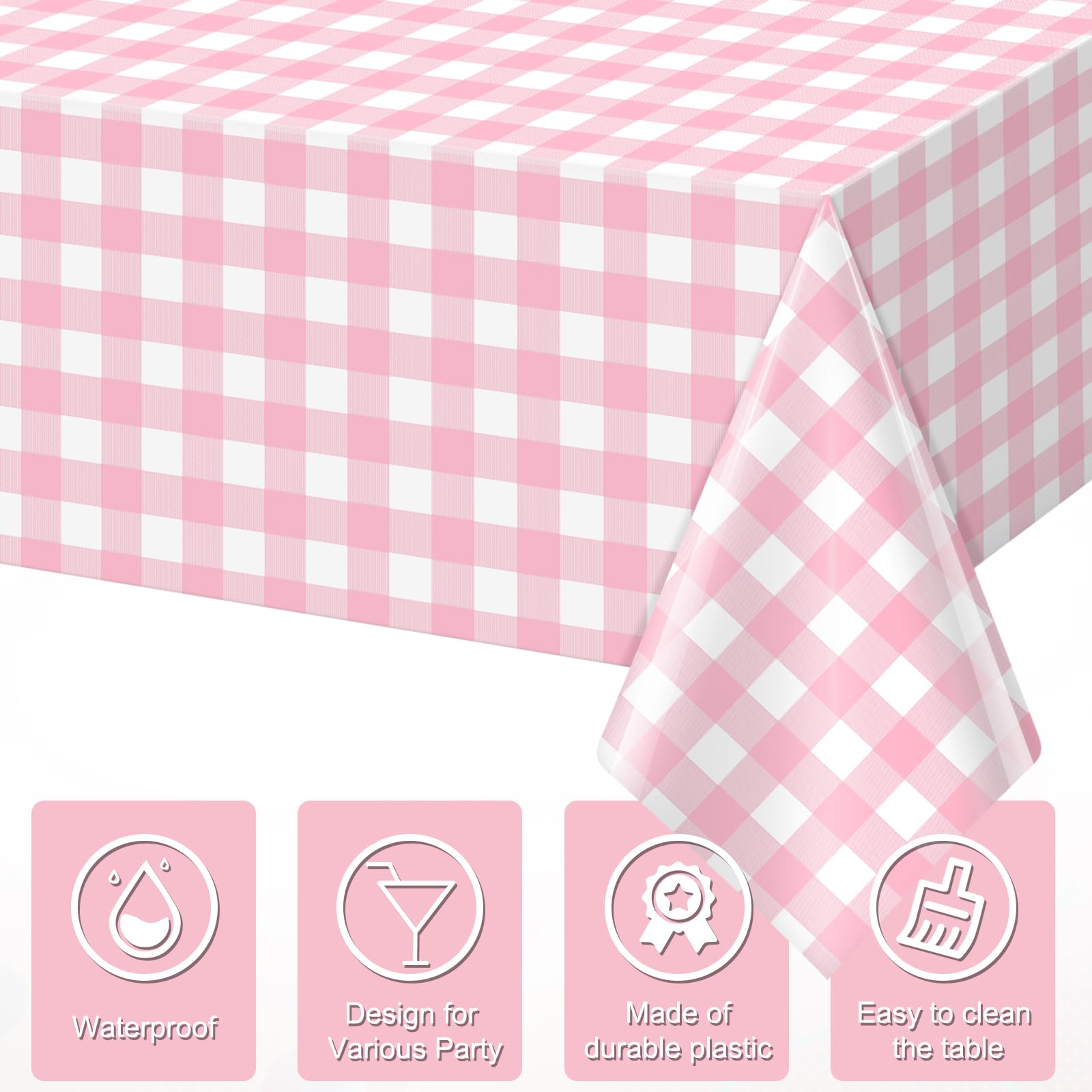 Quality Material:our pink gingham table cloth is made of high quality plastic material,it is waterproof,sturdy,dirt resistant and has a smooth surface,not easy to damage and can keep stains away,easier to clean.And light weight makes it easy to use indoors and outdoors.