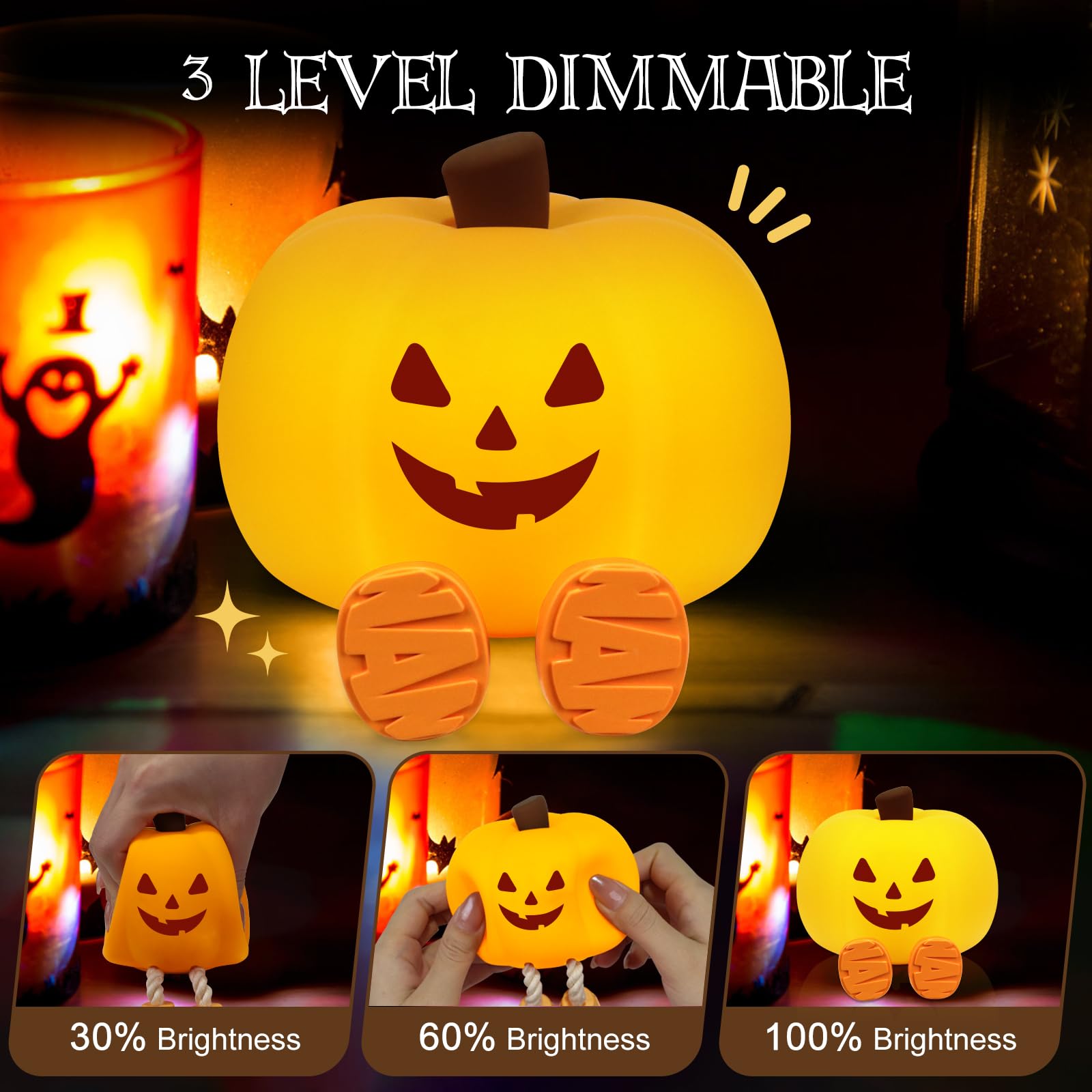 Anti-Blue Warm LED Light, Gentle to Eyes - As a good quality warm color little pumpkin sleep lamp for baby, Gefaxi fall night light for fall pumpkin decor uses the anti-blue LED light with 3000K warm white color, is stable and gentle to eyes, won't flicker or hurt your eyes! Moreover, the Gefaxi cute pumpkin night light for fall Halloween decor is adopted with a touch sensor, you could change the brightness of dimmable kids night light (weak, medium, strong, off) by tapping or pinching it.