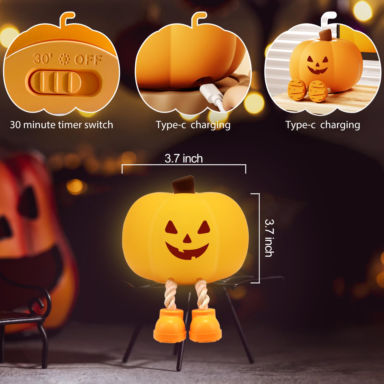 Lasts Up to 6H, Accompany You to Sleep - Gefaxi rechargeable Halloween pumpkin light has a built-in 500mAh battery and internationally accepted Type C charging port, takes 2 hours to get 100% charged, can be used up to 6 hours. Thanks to its wireless design, your child could take the warm color toddler night light for indoor pumpkin decor to bed and play with it until fall asleep. Built-in the timer off function, Gefaxi autumn night light for boys girls will automatically turn off 30 minutes.