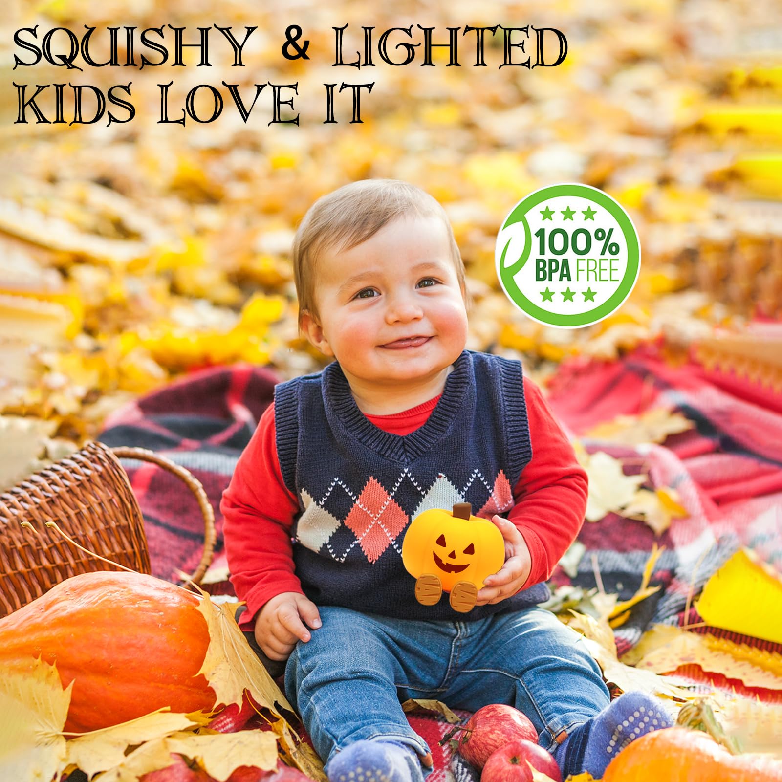 Squishy Silicone Material, Safe for Child - Using the safe silicone material as the lampshade, safe ABS material as the lamp base, Gefaxi squishy Halloween pumpkin nightlight for kids has passed several international safety standards, won't heat up while in use, 100% safe for your child! Gefaxi cute Halloween pumpkin decor baby night light is easy to clean, the silicone lampshade can be directly rinsed with water, BUT the lamp base CANNOT contact with water!