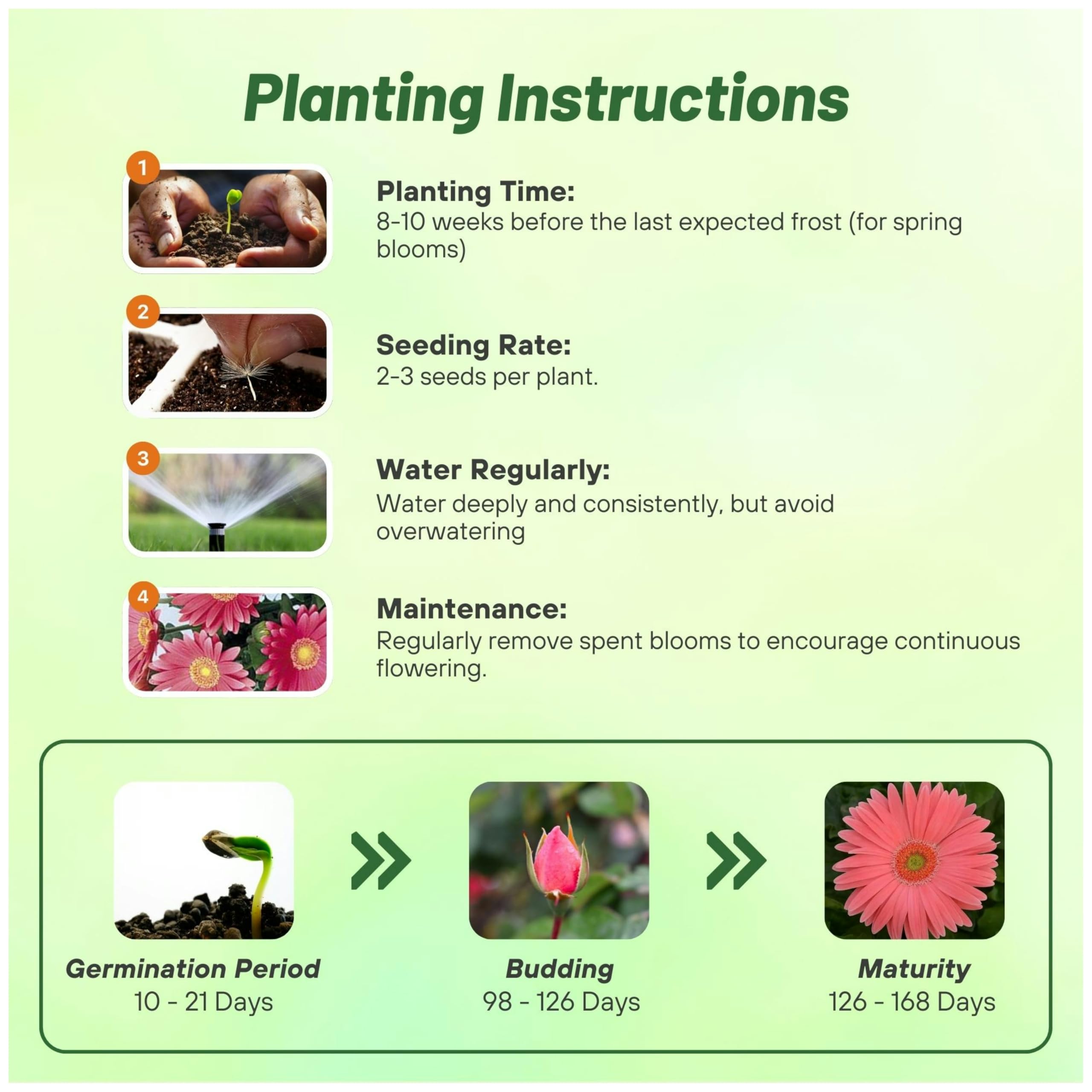 LOW-MAINTENANCE & VERSATILE: Thriving in full sun to partial shade, our hardy plants only require a sow rate of 2-3 seeds per plant in a well-drained soil (pH 6.1-7.5) with 10-15 inch spacing, then cover thinly under 70F degrees while allowing a germination time of 10-21 days for optimal results. Their versatility makes them ideal for landscaping, cutting gardens, pots, and indoor arrangements.