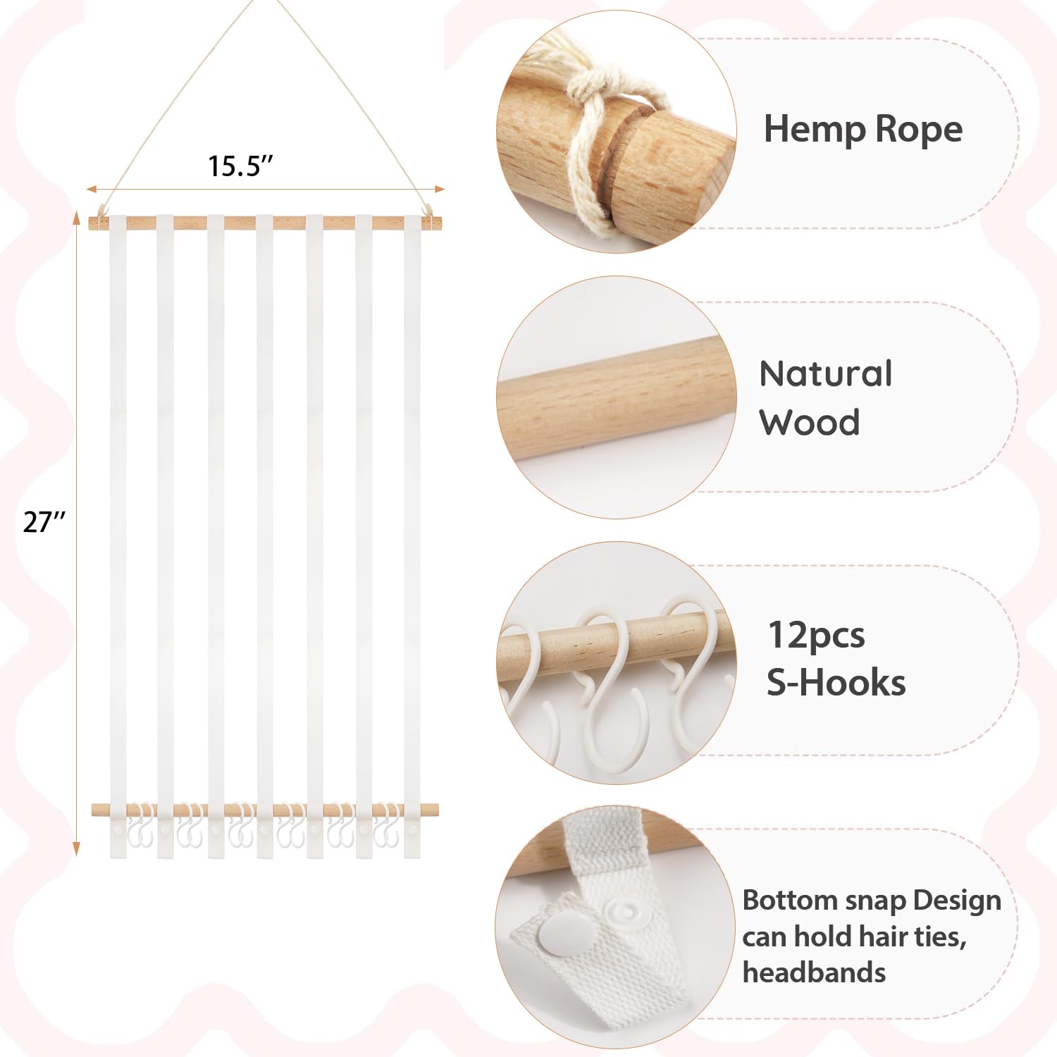 【High Quality Materials】- The plastic S-hook of the bow hanger for girls hair bows is very suitable for storing baby headbands and is not easy to fall off. The storage pocket is made of high-quality cotton canvas and has good load-bearing capacity. The wooden stick is very smooth and sturdy, not easily deformed or cracked, making it more durable.