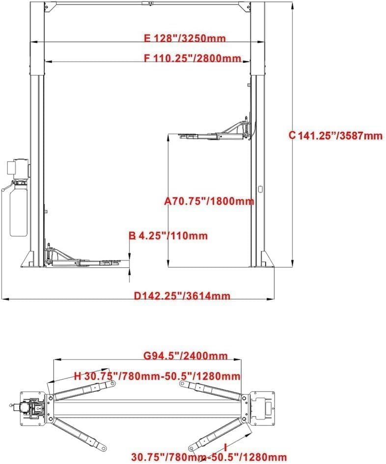 KT-M110 Two-Post Car Lift – 11,000 lbs (5000kg) Capacity 12 Months All Parts Warranty! Technical Specifications Lifting Capacity: 11,000 lbs (5,000 kg) Max Lifting Height: 70.75" (1,800 mm) Min Height: 4.25" (110 mm) Overall Height: 141.25" (3,587 mm) Overall Width: 142.25" (3,614 mm) Column Spacing Outside: 128" (3,250 mm) Inside: 110.25" (2,800 mm) Drive-Thru Clearance: 94.5" (2,400 mm) Arm Reach (Front/Rear): Max: 50.5" (1,280 mm) – 2-stage adjustment Min: 30.75" (780 mm) – 2-stage adjustment Motor: 220VAC/60Hz/1PH, 2.2KW Net Weight: 1,367 lbs (620 kg) Safety & Durability Rigorous Load Testing – Built to exceed 115% dynamic and 150% static load capacity standards. Industrial-Grade Construction – Designed for professional workshops, garages, and heavy-duty use.