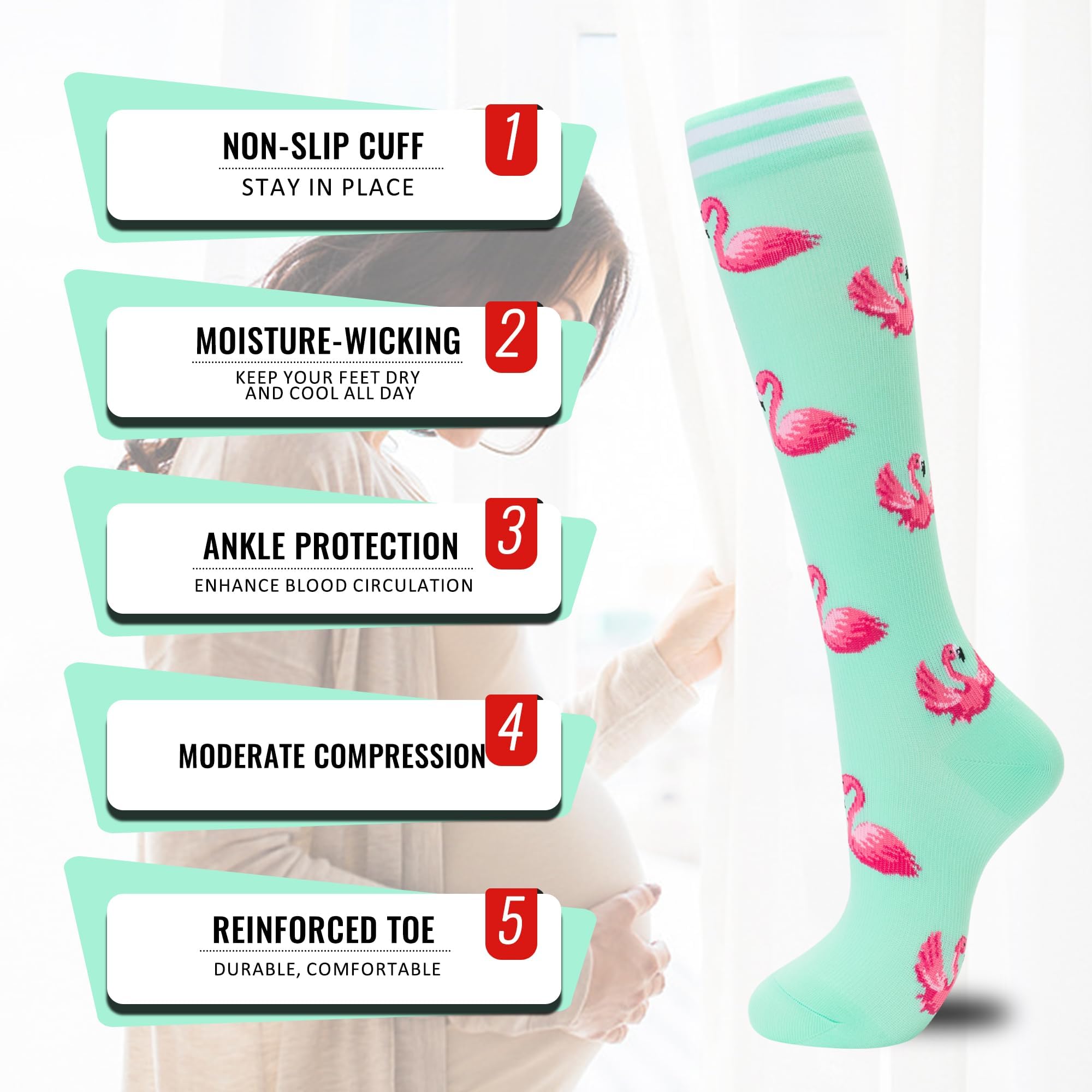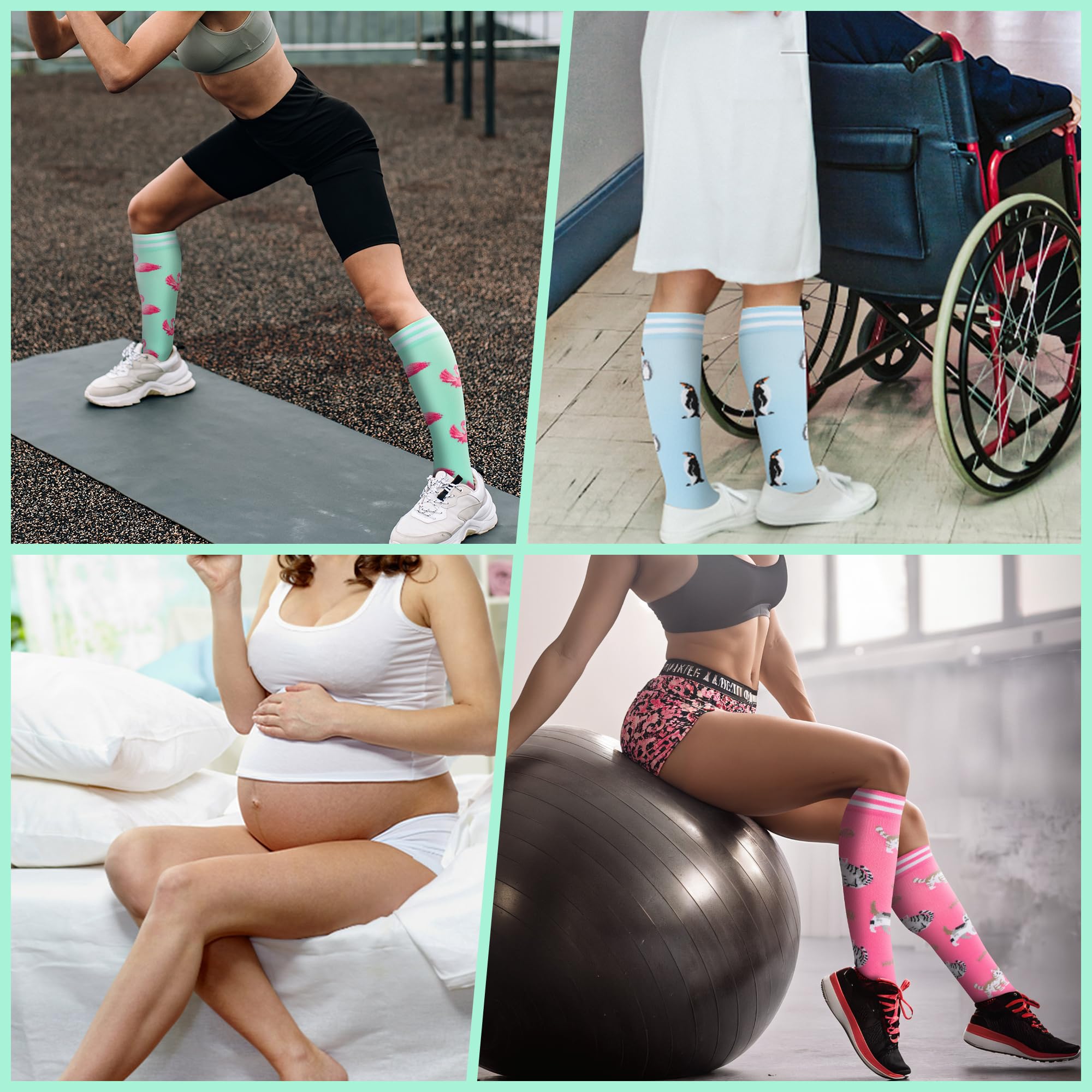 STYLISH COMFORT DESIGN We have prepared compression stockings for women with different cute animal prints for you. Brightly colored compression socks are with a unique pattern and reinforced toe and heel sections for added support and comfort. Just pick your favorite from these fun compression socks to show your personality and style