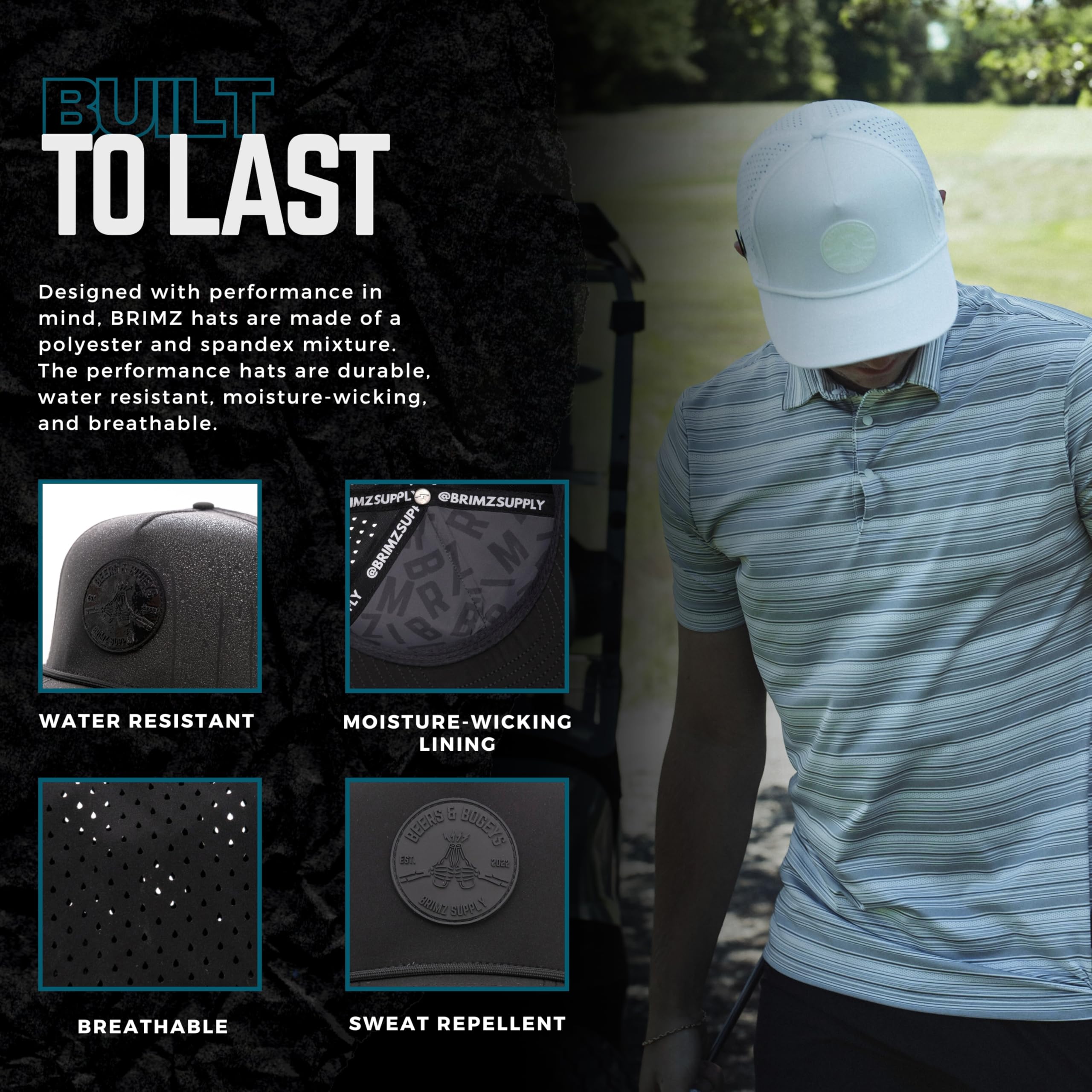 PERFORMANCE WEAR: Complete your golf gear with hats designed for a stylish look yet functional hat. Sweat and water resistant, with breathable material for cooling and a tough lightweight design make BRIMZ the ultimate outdoor performance hat.