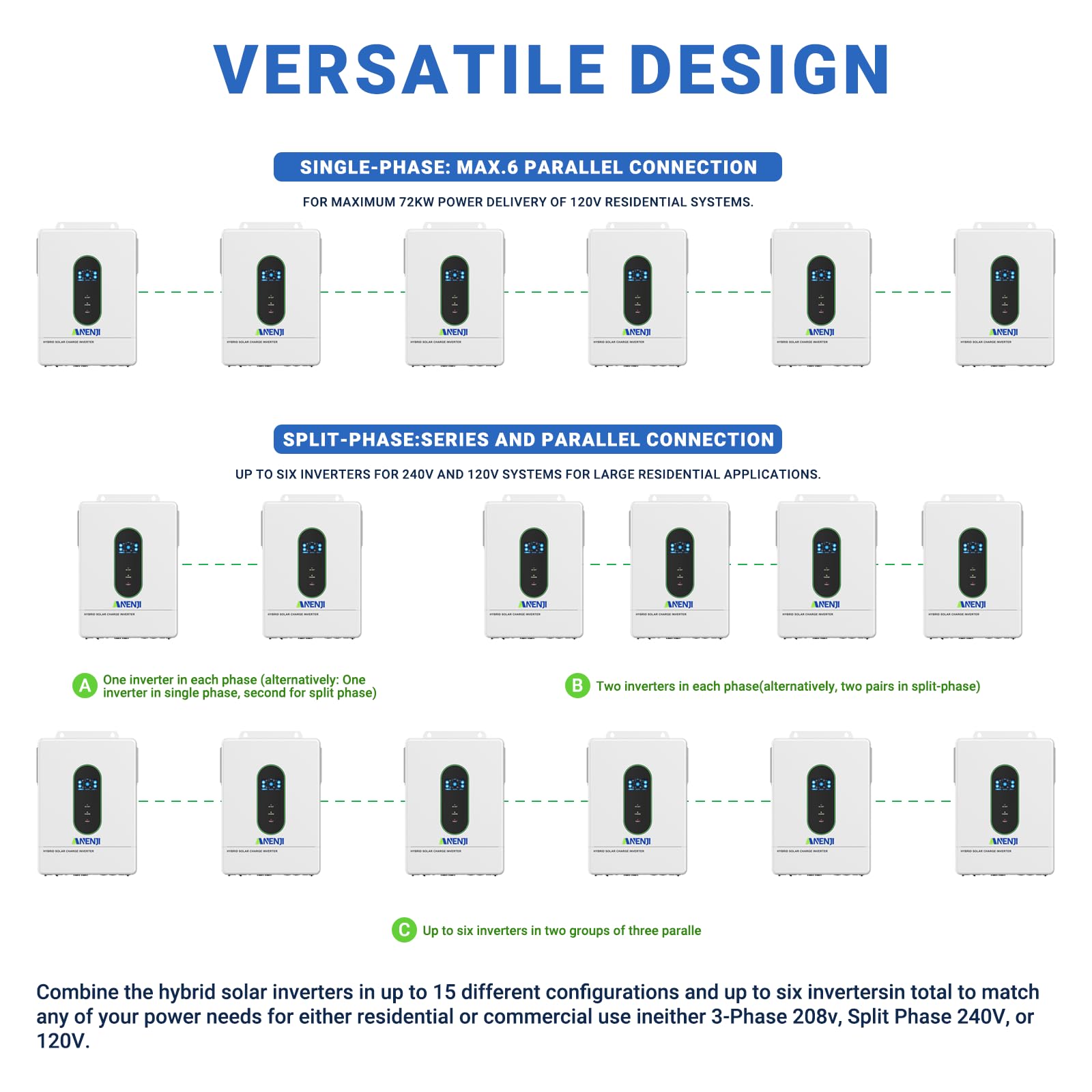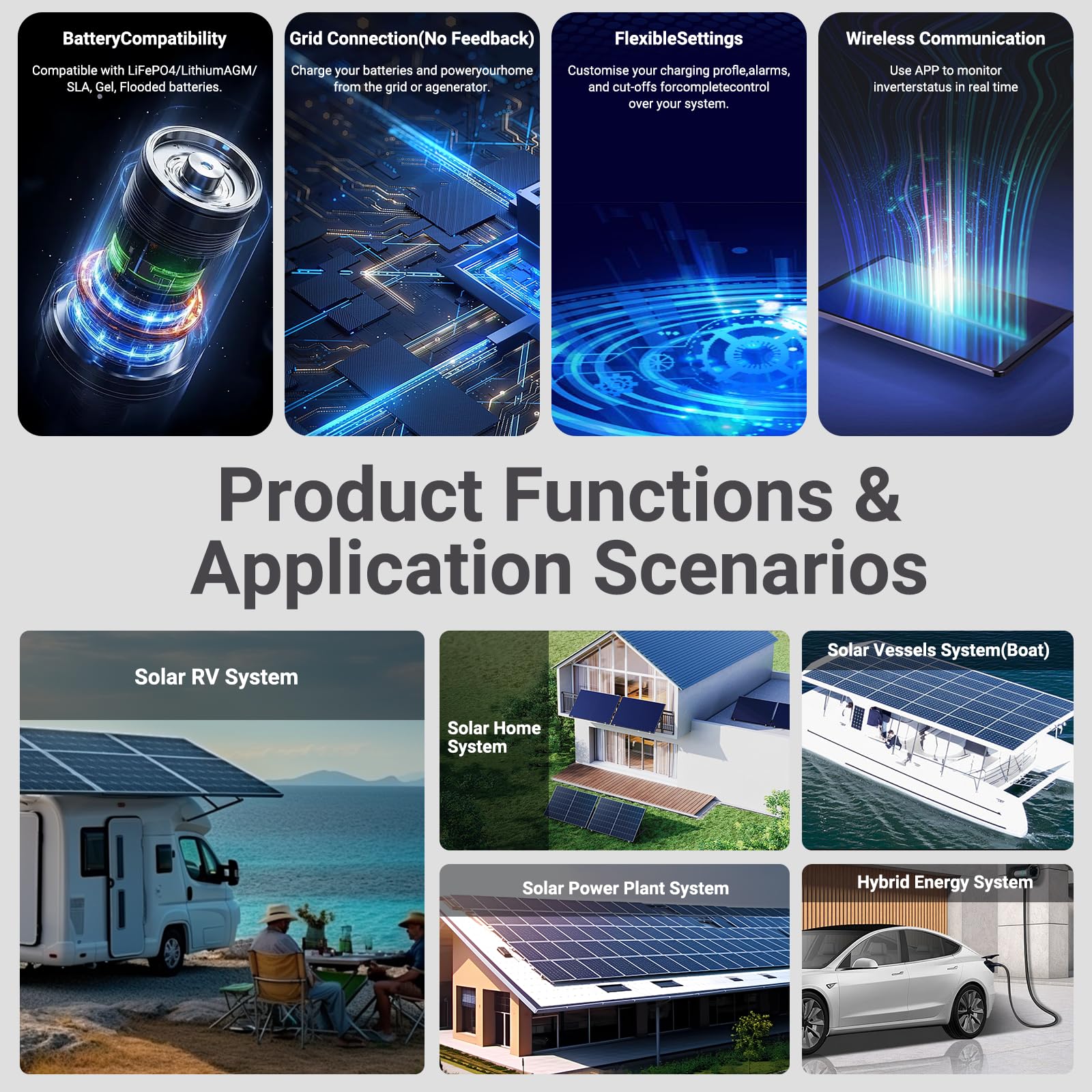 【ADDITIONAL APPLICATION AREAS】This powerful and versatile hybrid solar inverter is ideally suited for off-grid or on-grid solar applications in RVs, boats, vacation homes, and household or commercial backup power systems. It can power various electrical appliances up to 12000W continuous power, including demanding consumers like air conditioners (up to 6 HP) and motors. Supports parallel operation of up to 6 units for higher power capacity.