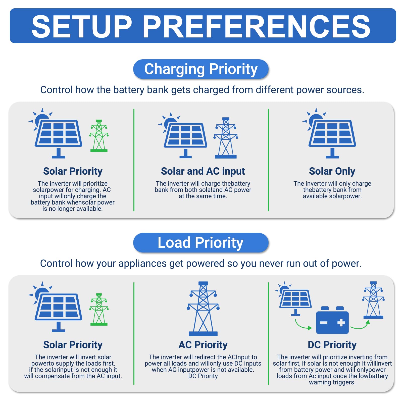 【VARIOUS OUTPUT MODES】The inverter offers several configurable AC output priority modes: Utility Priority (Line): Switches to battery/inverter power only when the mains fails. Battery Priority (Bat): Primarily uses battery power, only switches to utility power when the battery is low. Solar Priority (Solar): Primarily uses PV energy, switches to utility power when solar energy is insufficient or the battery is low. Hybrid Mode: The load is powered simultaneously by PV, battery, and grid (depending on settings and availability).