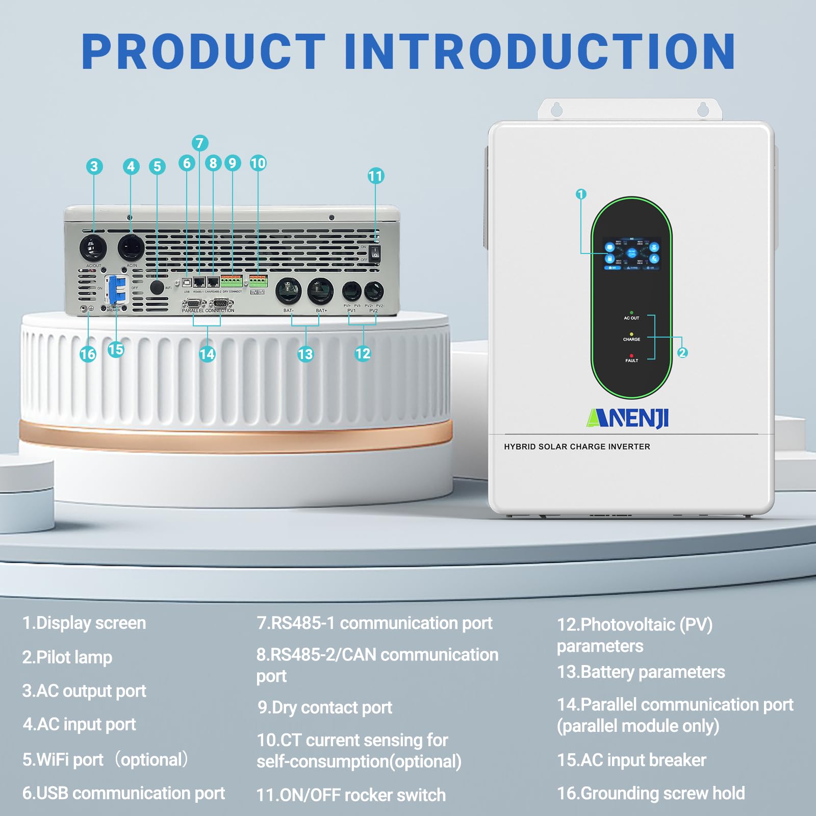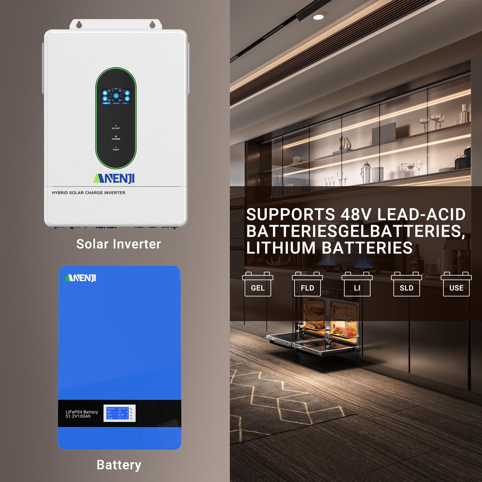 【OPERATION WITH AND WITHOUT BATTERIES】The ANJ Hybrid Inverters support standard battery operation mode and simultaneous battery-less operation. The inverter can power the load directly from the PV array and/or the AC grid (Mains) without requiring a battery to be connected. (When no battery is connected, the minimum PV operating voltage must reach 90 Vdc). Furthermore, the inverter features a dual lithium battery activation function (enabled by default), which can be triggered by PV or AC mains to reactivate a dormant battery.