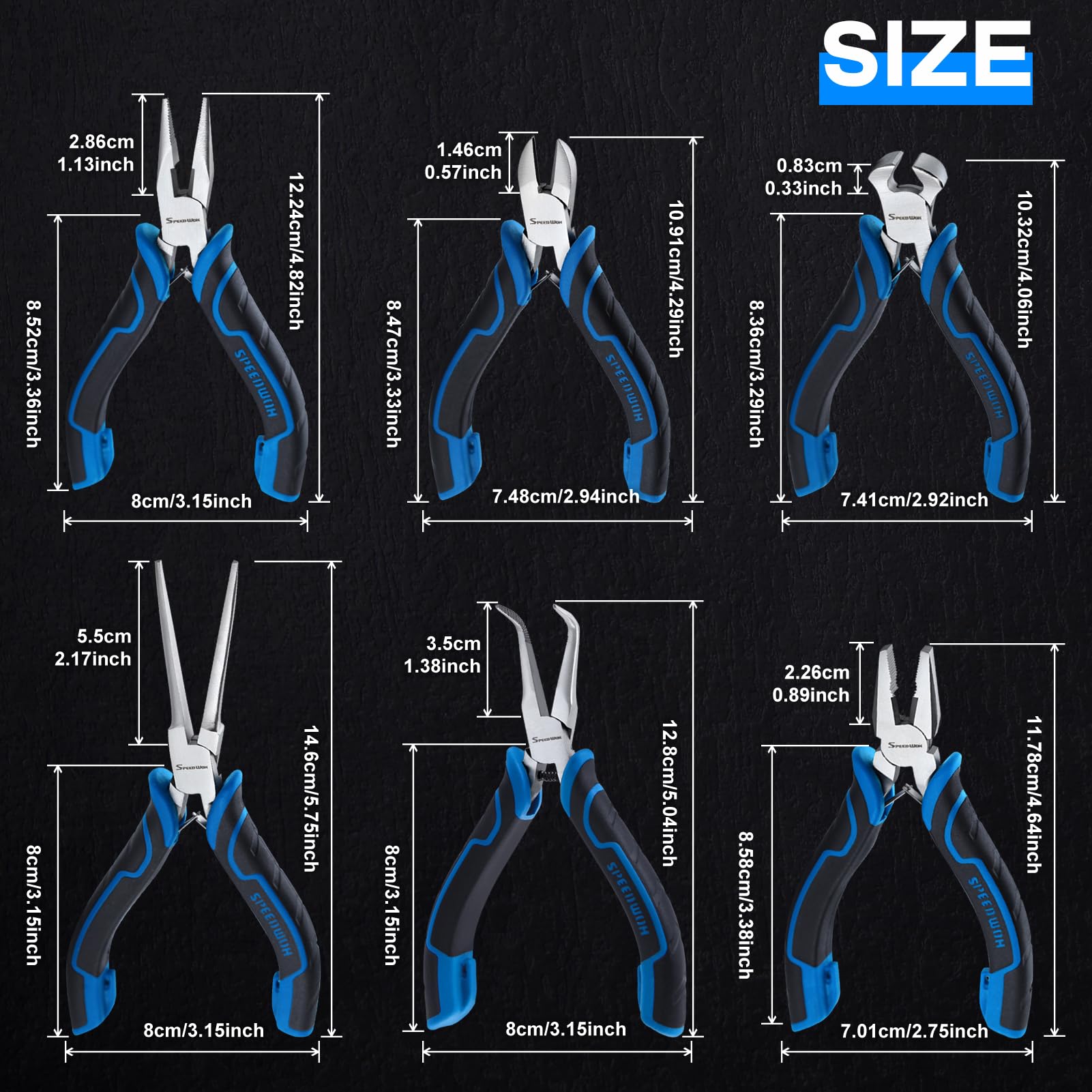 【DIMENSION】End Cutting Pliers: Length is 10.32cm/4.06"; width is 7.41cm/2.92"; height is 1.42cm/0.56". Bent Needle Nose Pliers: Length is 12.8cm/5.04 "; width is 8cm/3.15 ". Needle Nose Pliers: Length is 14.6cm/5.75 "; width is 8cm/3.15 ". Diagonal Pliers: Length is 10.91cm/4.29"; width is 7.48cm/2.94". Long Nose Pliers: Length is 12.24cm/4.82"; width is 7.05cm/2.76". Linesman Pliers: Length is 11.78cm/4.64"; width is 7.01cm/2.75".