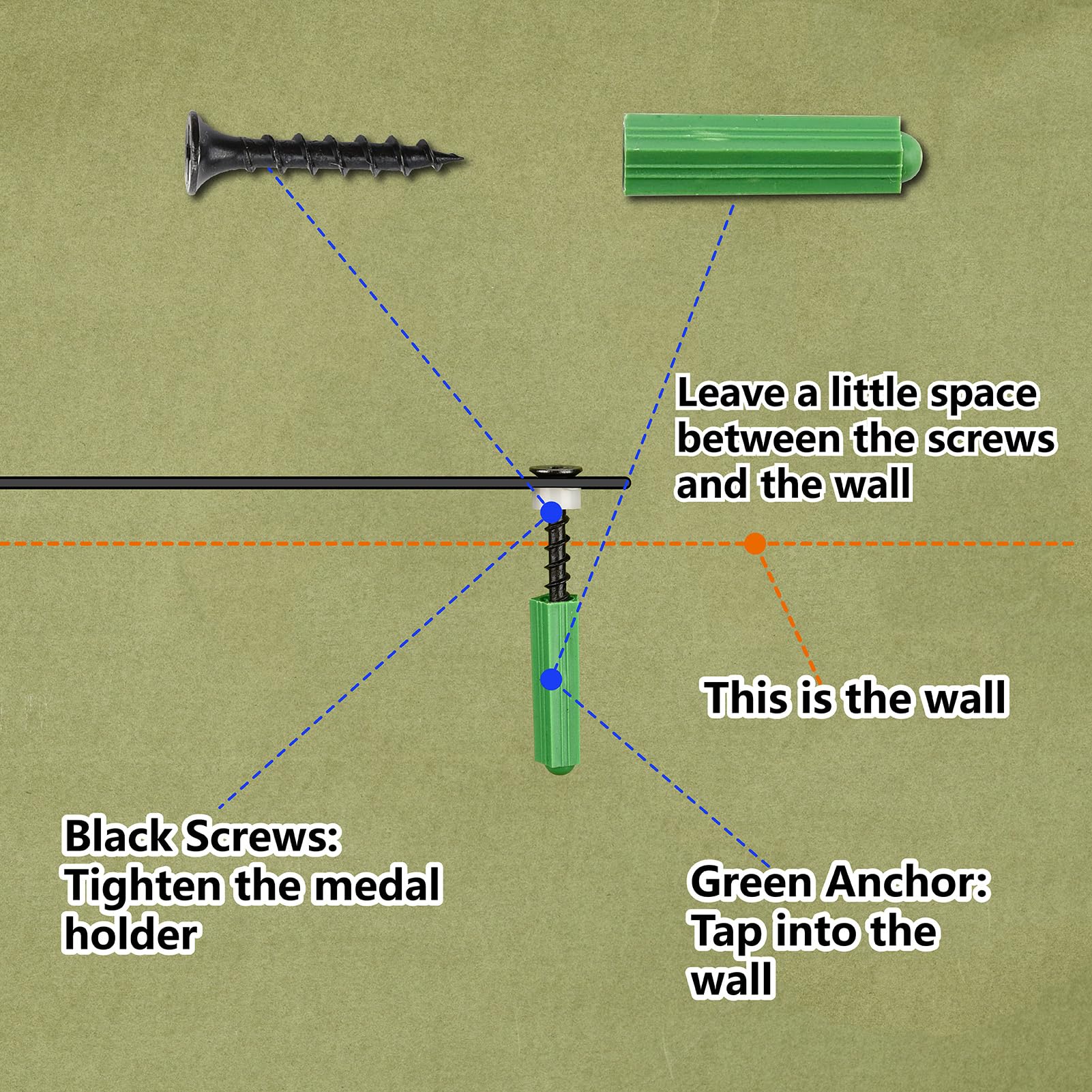 [EASY INSTALLATION]: ① Make the screw locations with a pencil. ② Use a power drill(5mm drill bit)to make holes for the wall anchors. ③ Tap the wall anchor gently to the wall.④ Put the hook in place and tighten the screws. (NOTE: Please keep distance between the anchor and the screw to prevent the medal hook from clinging to the wall, so as to facilitate the hanging of the medal)