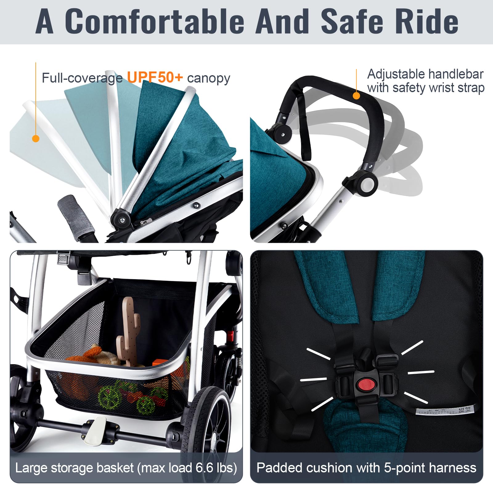 SAFETY DESIGN: The newborn stroller is equipped with 5-point harnesses to keep the baby secure. The pram stroller also features a one-foot brake, shock absorbers, and a sun canopy to enhance safety in different conditions.