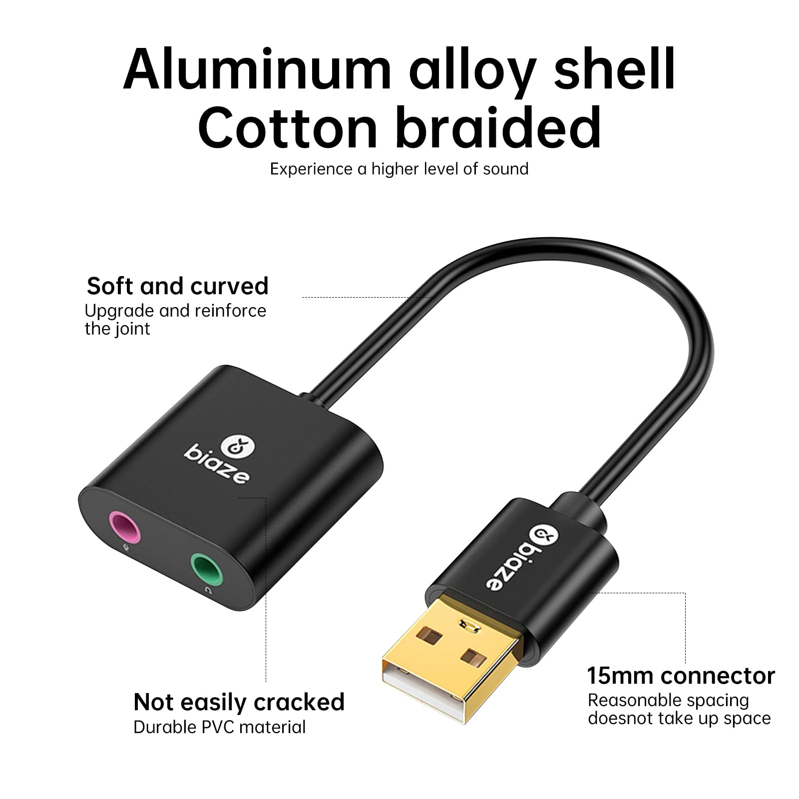 【USB Stereo Sound Card】This biaze USB audio adapter is ideal to replace your faulty sound card or audio port. It extends the 3.5mm mono microphone input and speaker-headphone output via the USB port, allowing you to connect small speakers, headphones, microphones, dual-plug headphones and more