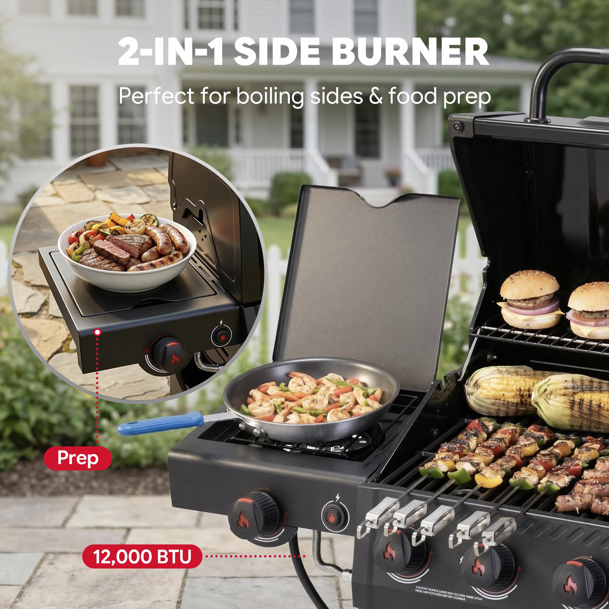Powerful 5+1 Burner System: This 5 burner gas grill features a 5+1 burner system with four main burners, a dedicated sear burner, and a convenient side burner. It delivers 58,000 BTU of total cooking power with consistent, even heat, and offers versatile cooking options perfect for searing, grilling, boiling, or preparing sauces, soups and side dishes all in one place