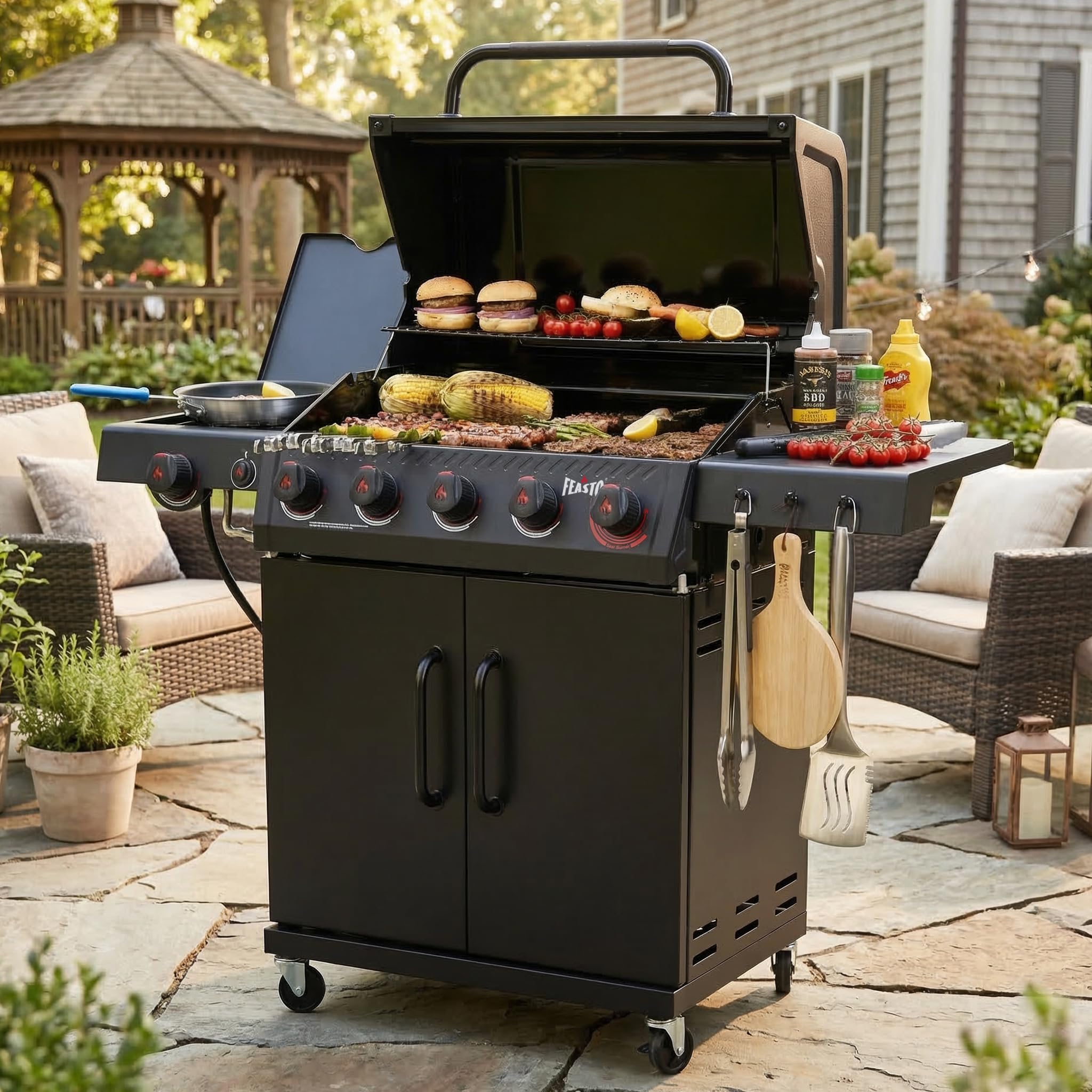 Spacious Prep & Storage: This 5 burner gas grill offers ample prep space and secure storage for all your grilling needs. Its enclosed cabinet neatly stores your propane cylinder and grilling accessories, while the side table with built-in tool hooks keeps utensils organized and within easy reach