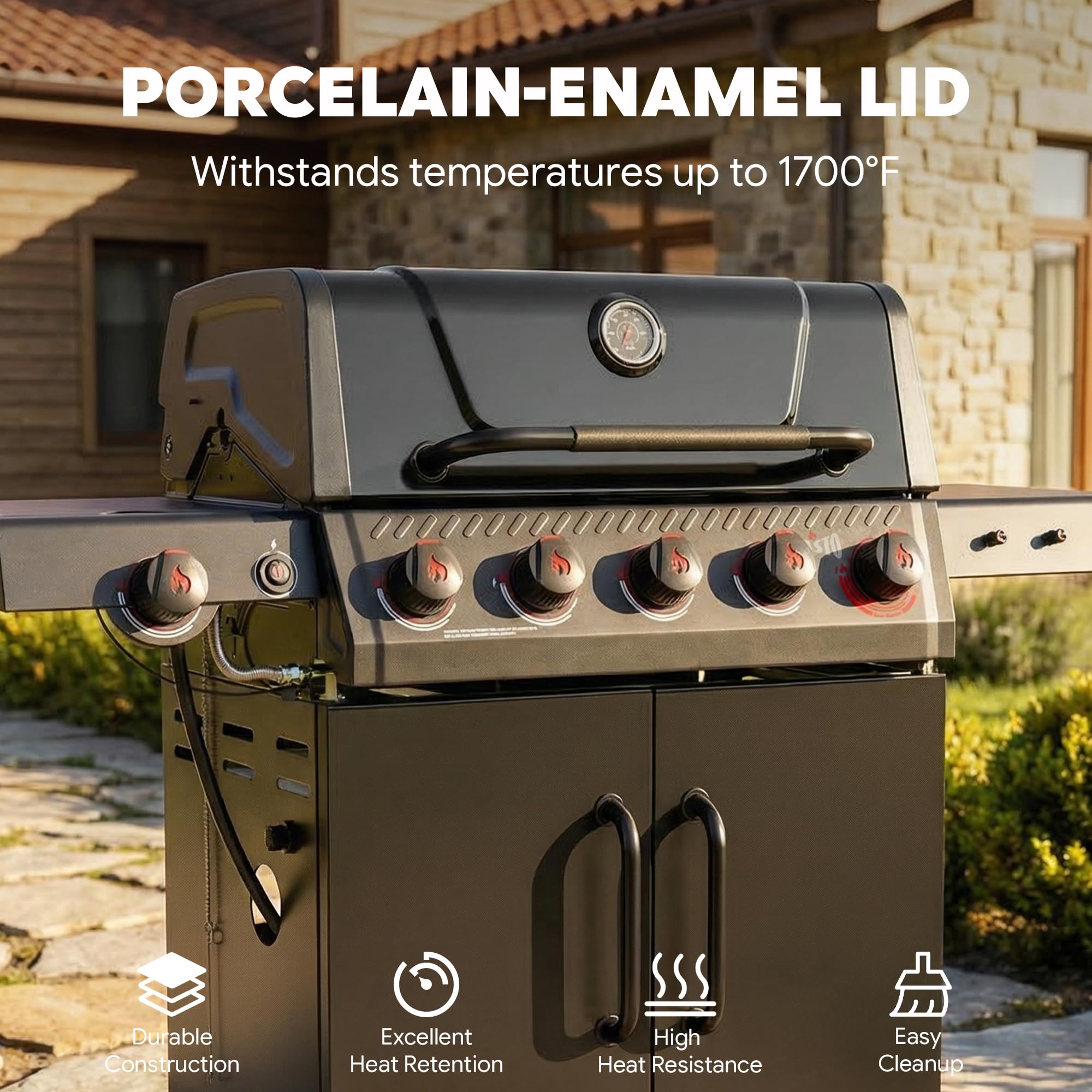 Porcelain-Enameled Body & Lid: This 5 burner gas grill features a body and lid constructed with porcelain-enameled steel on both interior and exterior, withstands temperatures up to 1700°F, and delivers superior rust protection compared to standard painted grills. Its smooth surface resists rust and peeling, ensuring long-lasting durability