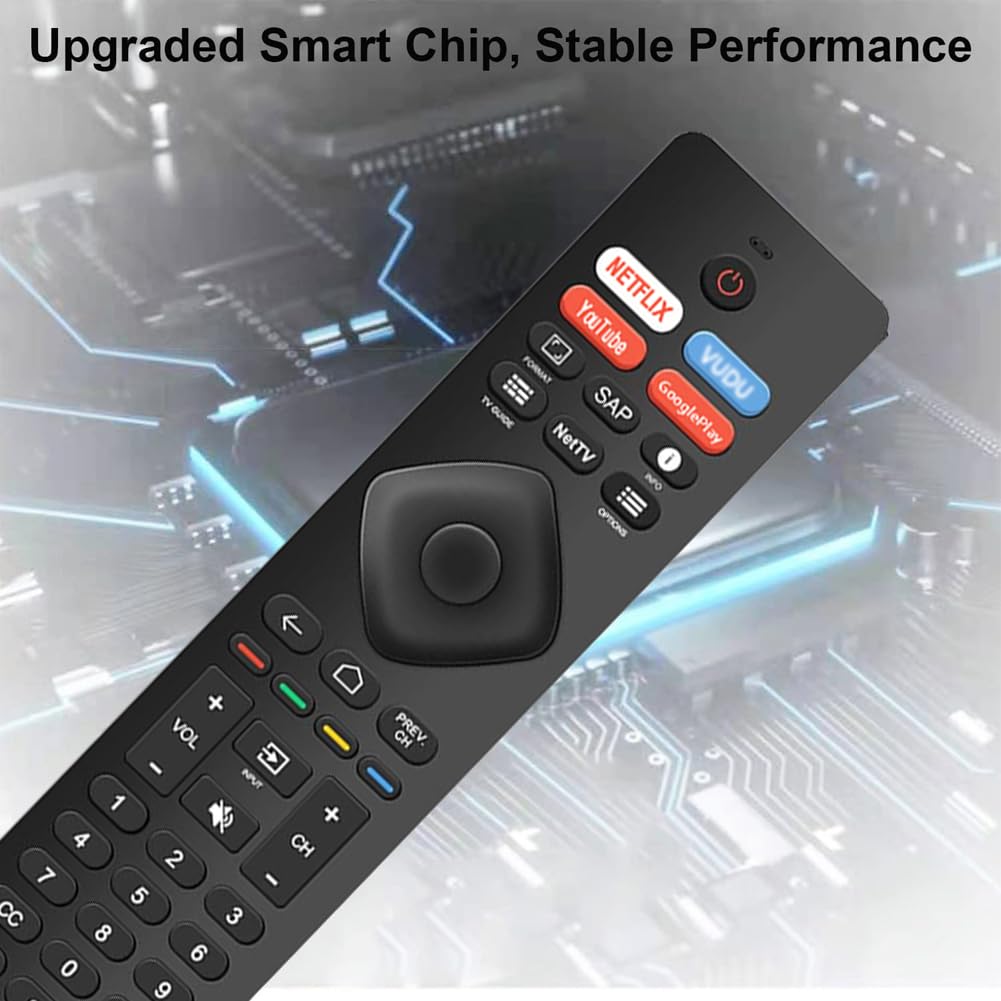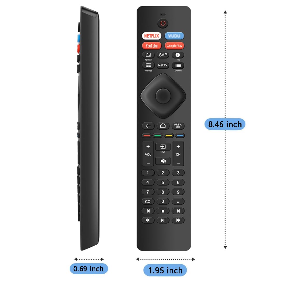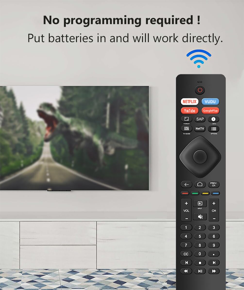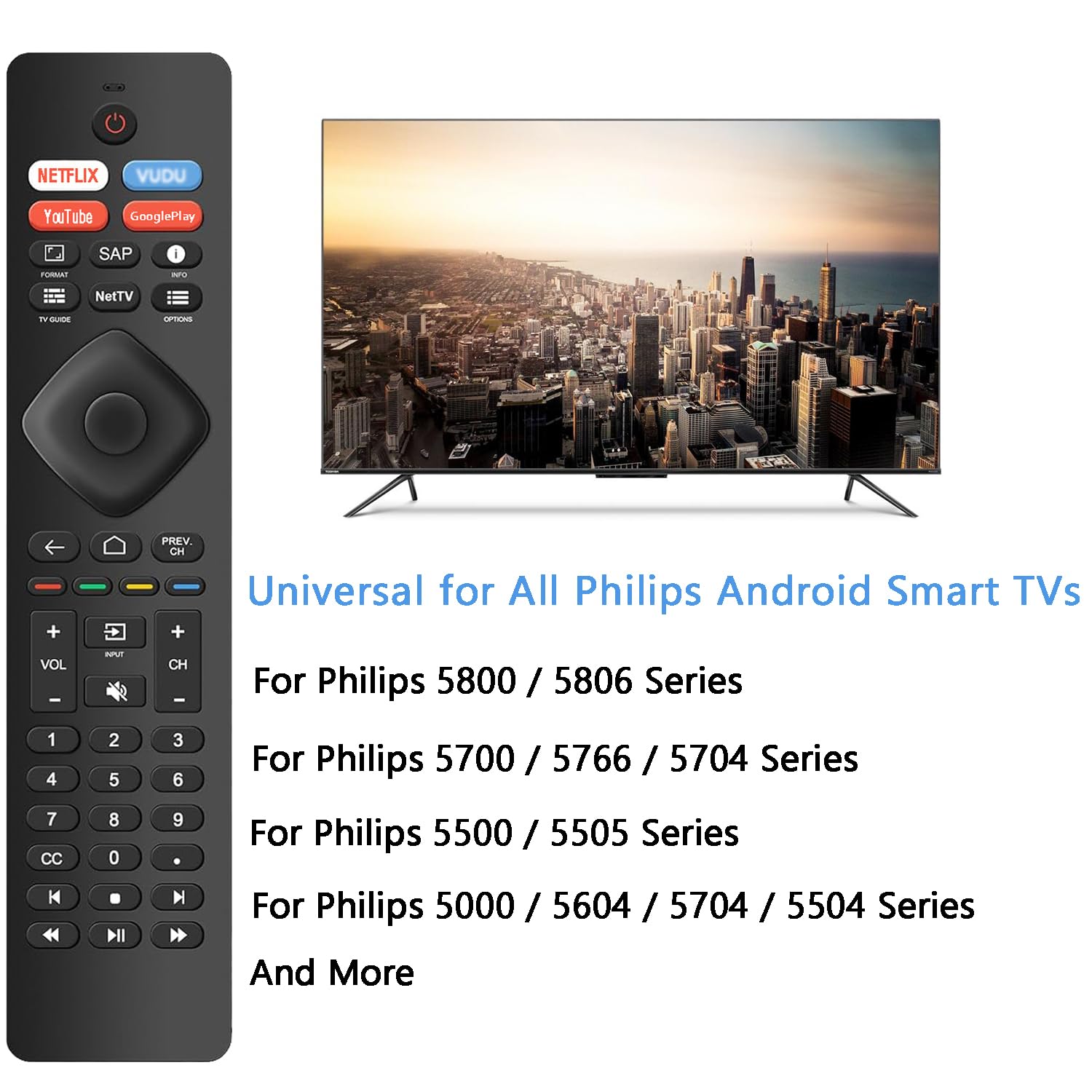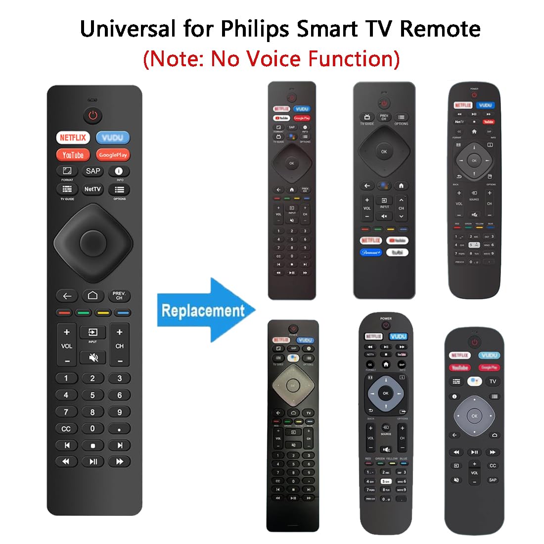 Universal Remote control for Philips All 4K Ultra LED LCD HDTV 3D UHD Smart TVs (Without Voice Function). Universal Remote control for Philips Smart TVs: 75PFL5604/F7, 75PFL5704/F7, 32PFL5505/F7, 65PFL5604/F7, 55PFL5604/F7, 50PFL5806/F7, 50PFL5604/F7, 43PFL5604/F7, 50PFL5604/F7A, 43PFL5766/F6, 50PFL5766/F6, 65PFL5766/F6, 55PFL5766/F6, 55PFL5704/F7, 65PFL5704/F7, 65PFL5704/F7A, 50PFL5704/F7, 43PFL5704/F7, 65PFL5504/F7, 65PFL5604/F7A, 55PFL5604/F7A, 75PFL5604/F7A, 75PFL5704/F7A, 75PFL5604/F7E, 55PFL5766/F7E, etc. Easy to Use: No Programming or Paring is Needed, only 2 AAAbatteries need to be inserted (packaging NOT includes AAAbatteries). Hot Keys to Quickly Access: Access popular streaming channels includes GooglePlay, Netfilx, You Tube and VUDUwith just one key, saving you time and allowing you to enjoy leisure activities more quickly. High-Quality: ABSmaterial: Shock-resistant, water-resistant, and eco-friendly. Rigorous button testing: Every button survives 3,000–5,000+ clicks (industry-standard durability). After-sale Service: We attach great importance to the customer's experience of using remote controls. Remote come with 18 months FREEwarranty. If you have any questions about your order or product, we will reply within 24 hours and try our best to help you solve each issue.