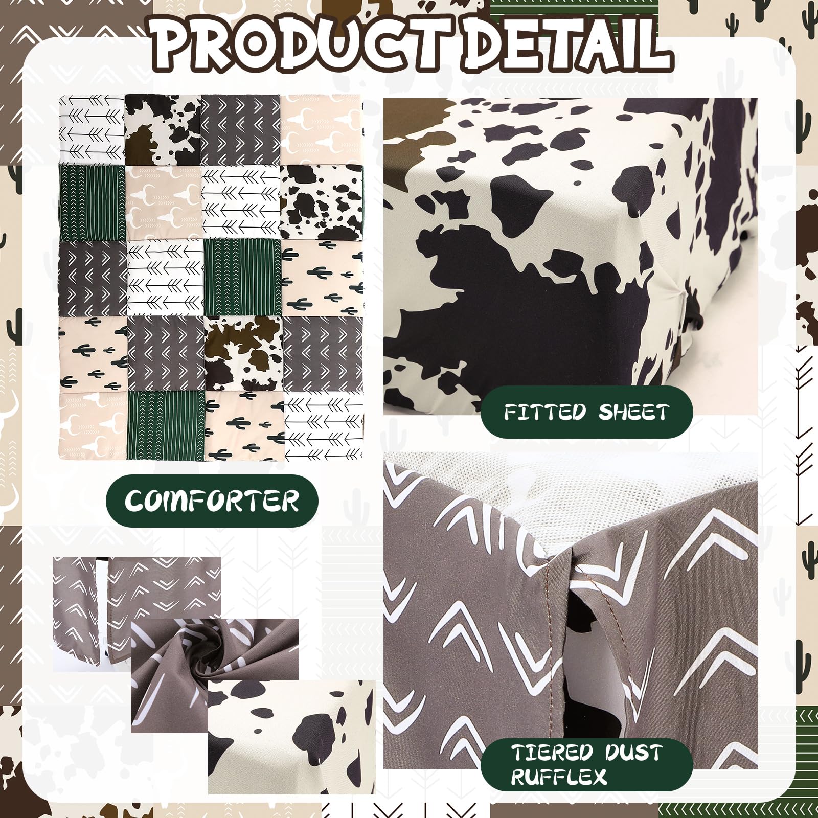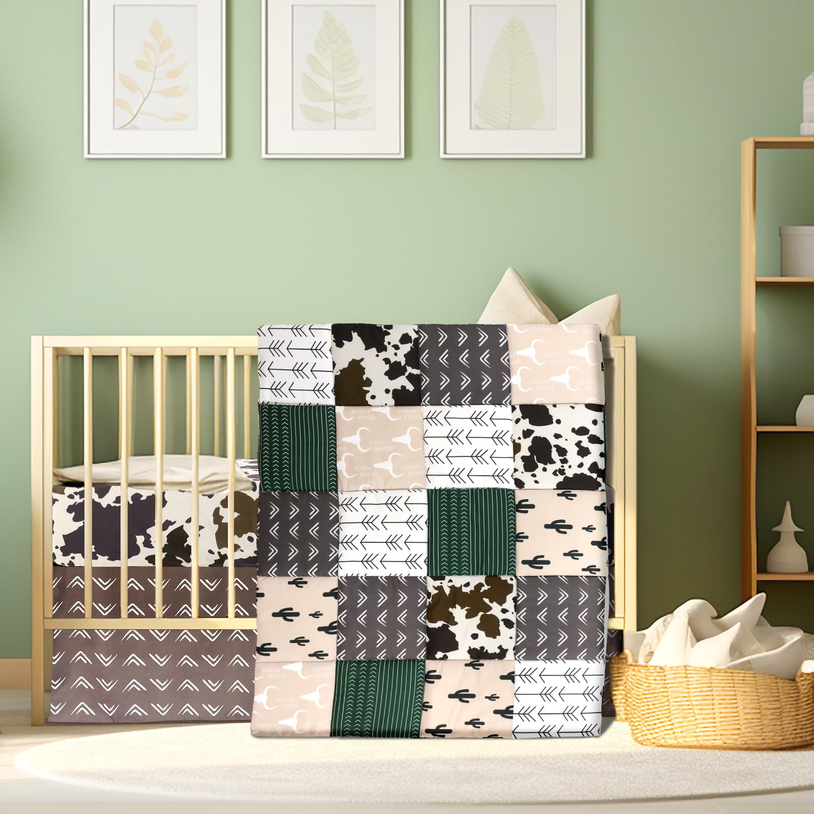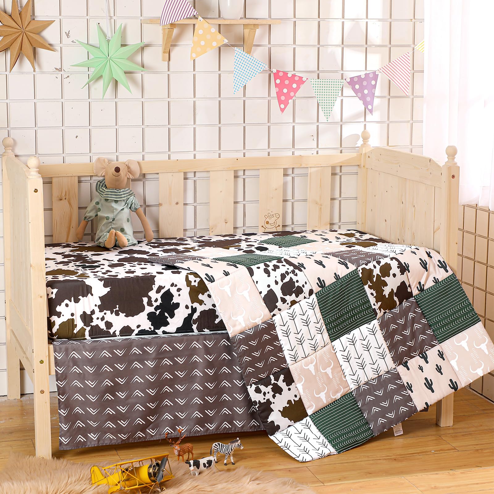 Complete Bedding Set: this fantastic Western themed baby crib bedding set comes with 1 pcs cotton quilt, 1 pcs bed sheet, 1 pcs bed skirt; All the elements you need for a stylish and comfortable crib setup are included in one convenient package, saving you time and effort in selecting and matching