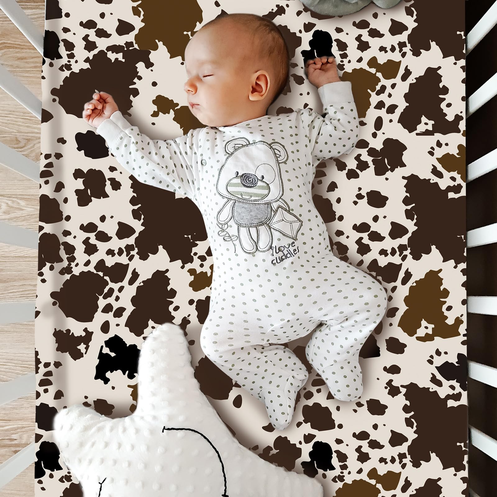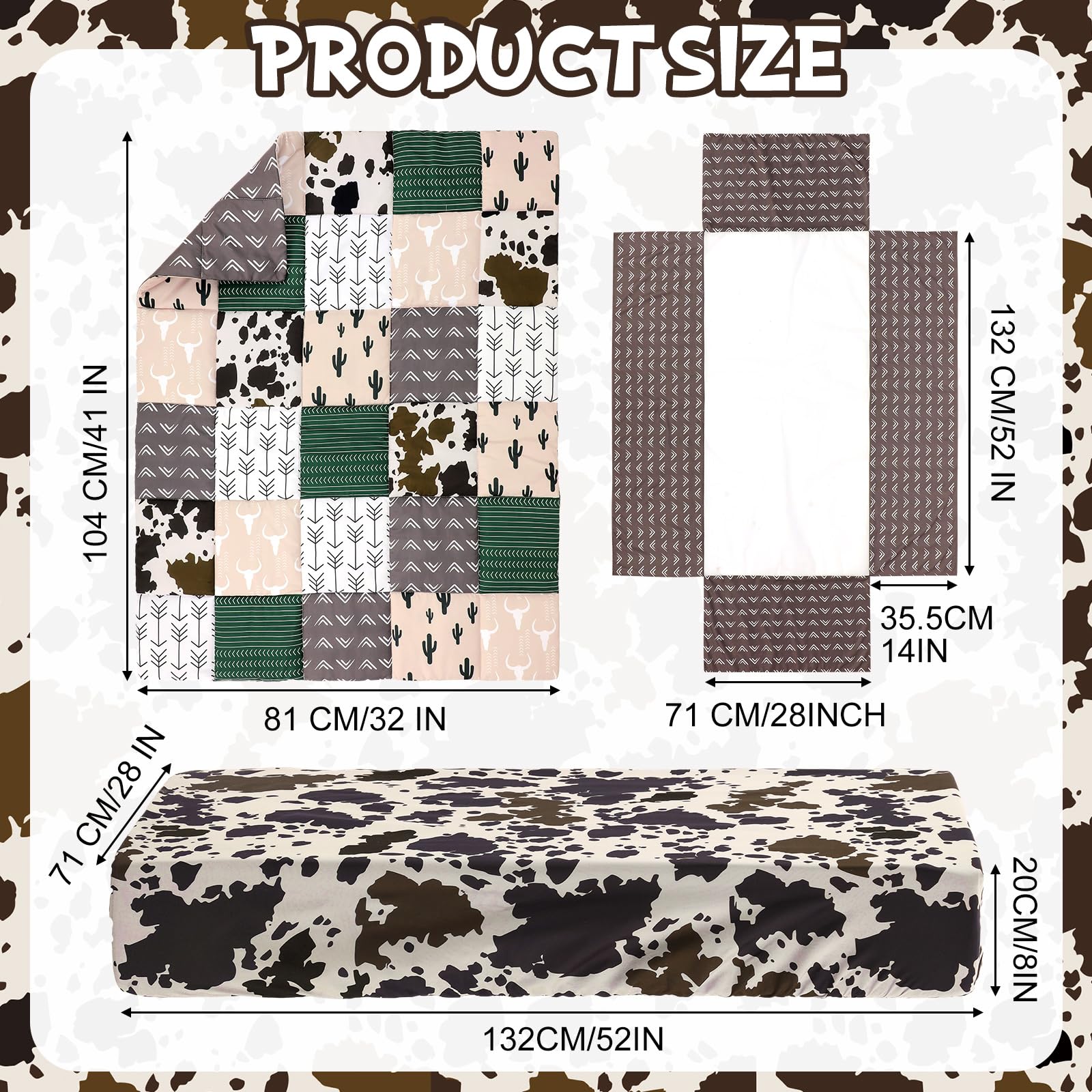 Features: A Snug Fit: The included bed sheet features elastic bands to ensure a tightly secure fit to the mattress. Making for a safe and serene sleep environment for your baby. An Ideal Gift Choice: Whether it's baby's first month celebrations, birthdays, baby showers, housewarmings, baby photos, this adorable cow crib bedding set makes the ideal gift. This is not just an accessory. It's a testament to comfort, style, and functionality. Specifications: Material: Polyester Color: brown and green Size: Western baby blanket: 32 x 41 inches /81 x 104 cm Bed sheet: 28 x 52 inches /71 x 132 cm Bed skirt: : 28 x 52 inches /71 x 132 cm Hem size of the bed skirt: 14 inch /35.5cm Package includes: 1 x Western baby blanket 1 x Bed sheet 1 x Bed skirt Notes: Manual measurement, please allow slight errors on size. The color may exist a slight difference due to different screen displays.