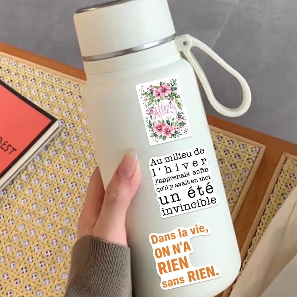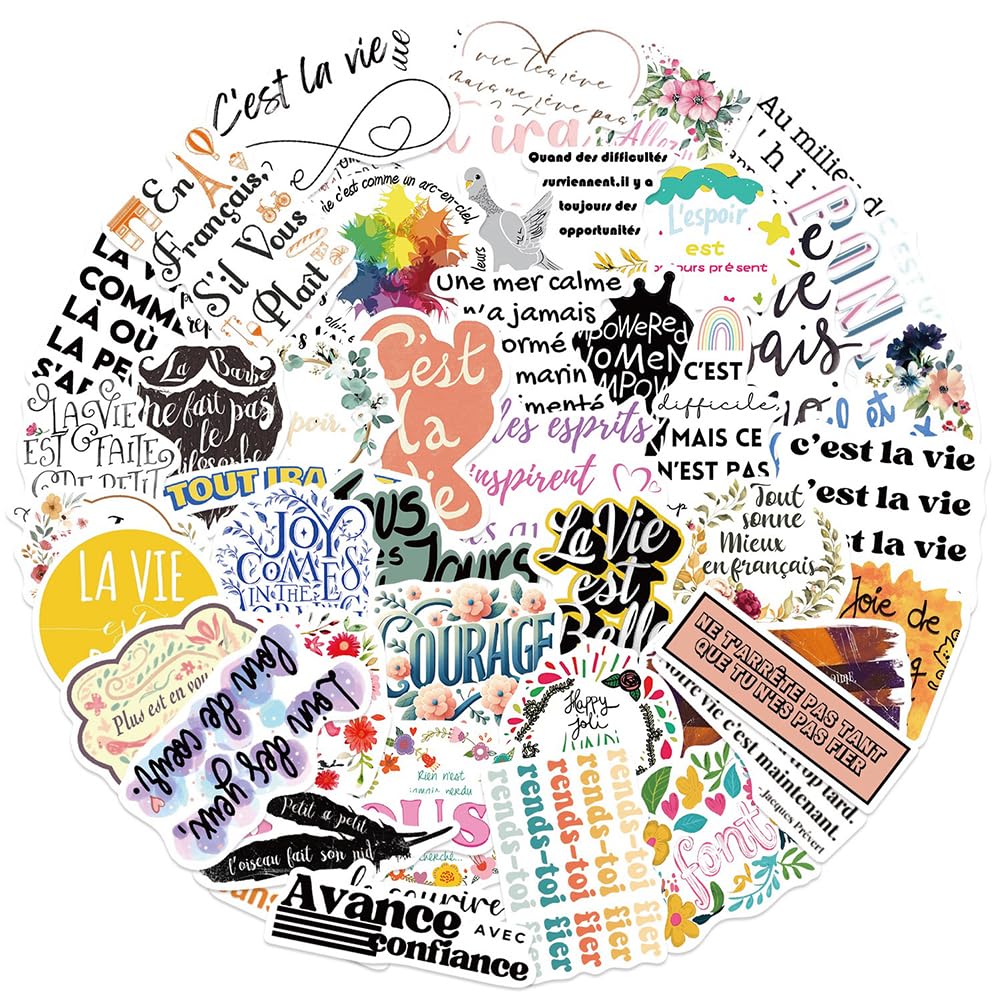 ◊●Wide Application●◊ ----These French Motivational Words Stickers can be attached to laptop, suitcase, computer, skateboard, refrigerator, wardrobe, wall, guitar, car, motorcycle, bike, etc. 50 different patterns to satisfy your decorating wish.
