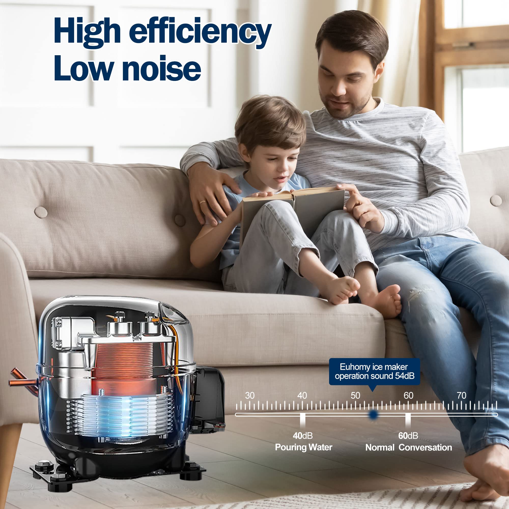 EFFICIENT & QUIET - You can enjoy the experience of this under counter ice maker all the time. The powerful compressor allows the under counter ice machine to complete the ice making process efficiently without causing too much noise. High efficiency and low noise provide you with a comfortable environment to enjoy your high-quality ice. At the same time, Euhomy industrial ice maker has an energy certificate to help you save electricity bills. In the long run, this will good for your wallet.