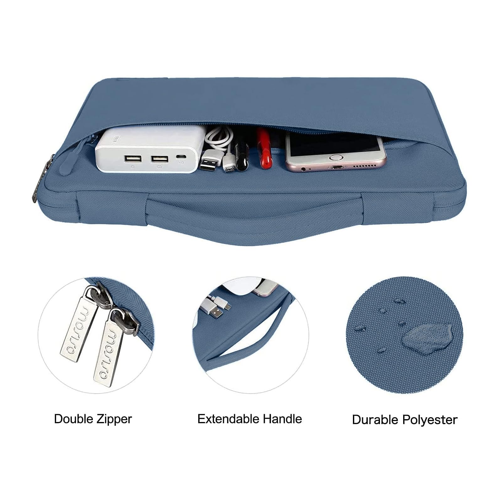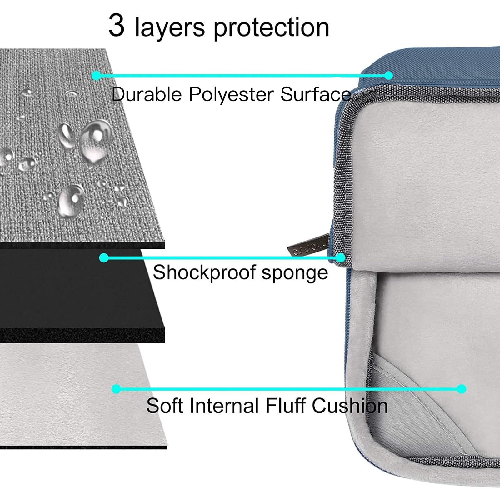 The 360 degree protective shockproof laptop sleeve with handle carrying bag internal dimension: 13.39 x 9.25 x 0.79 inches (L x W x H); external dimension: 13.98 x 9.84 x 0.79 inches (L x W x H). The front side pocket dimension: 11.61 x 9.25 inches (L x W). Made of polyester material, protect your laptop against accidental spills. Slim and lightweight, does not bulk your device up and can easily slide into your briefcase, backpack or other bag. Ideal for business, daily and travel.
