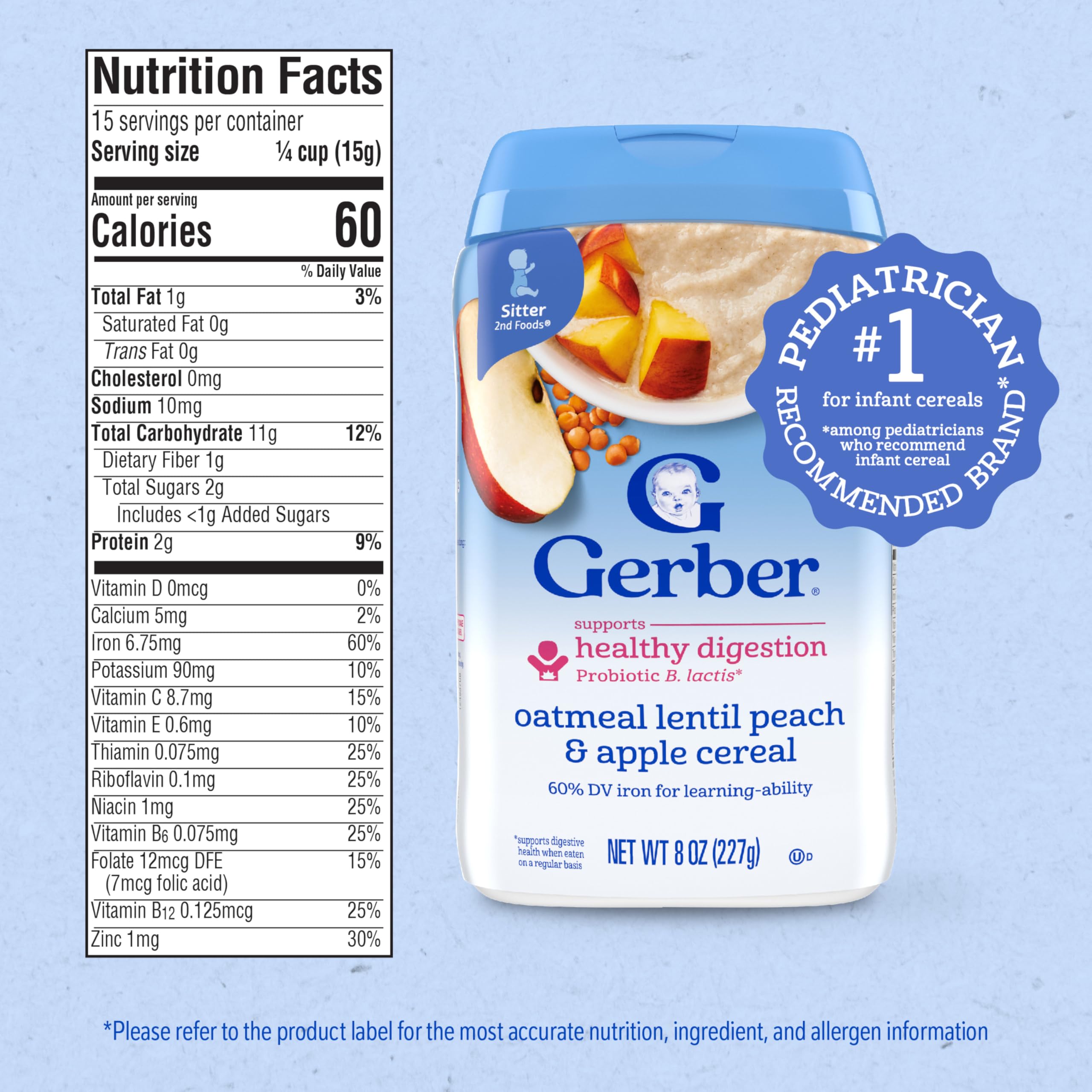 Gerber Cereals is a #1 Pediatrician recommended brand for infant cereals*. Our Oatmeal Lentil Peach & Apple Cereal is made with wholesome ingredients and strict quality standards just for babies. Our infant cereal is an ideal choice for your little one -- with its quick and easy preparation, this baby cereal offers a convenient and nutritious solution for busy parents. Gerber understands the importance of providing nutritious food as your baby grows and develops, thatβs why our baby cereal has no artificial colors or flavors -- and with 11 essential nutrients, our baby cereal is a food you and your little one can feel good about. Gerberβs dedication to quality and nutrition has been and always will be our highest priority. We're committed to being your partner in parenthood with quality ingredients, nutritious food & expert guidance. *Among pediatricians who recommend infant cereals.