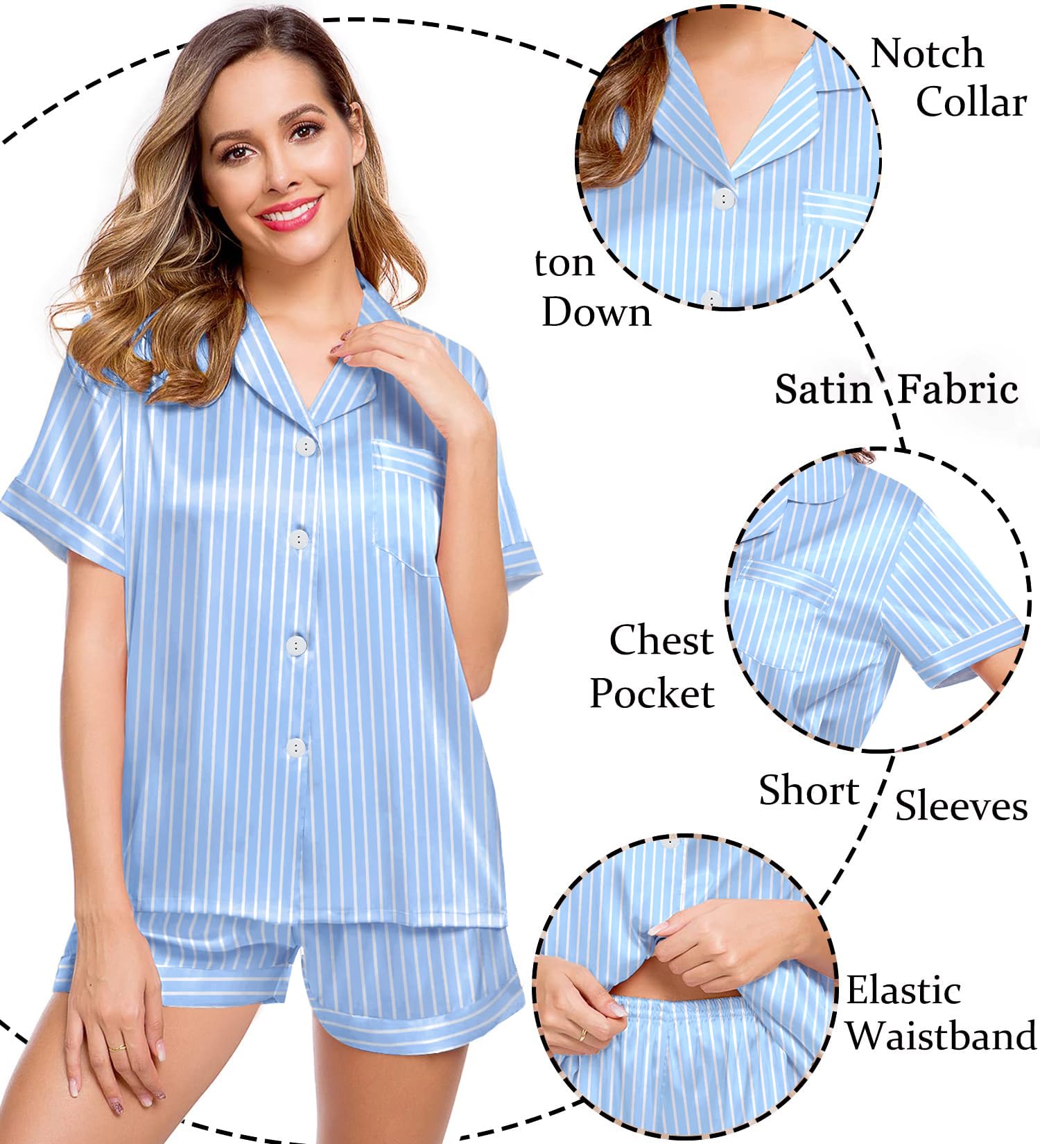 ❤ DESIGN: Two piece pajamas set featuring casual loungewear set style, include short sleeve pajama top and bottoms.The short-sleeve top is classic and convenient with a chest pocket and notch collar and button down shirt collar.This pajamas feature a full button down that is easy to put on and take off. The cute matching sleep shorts with elastic waistband to make relaxing as comfortable as possible.