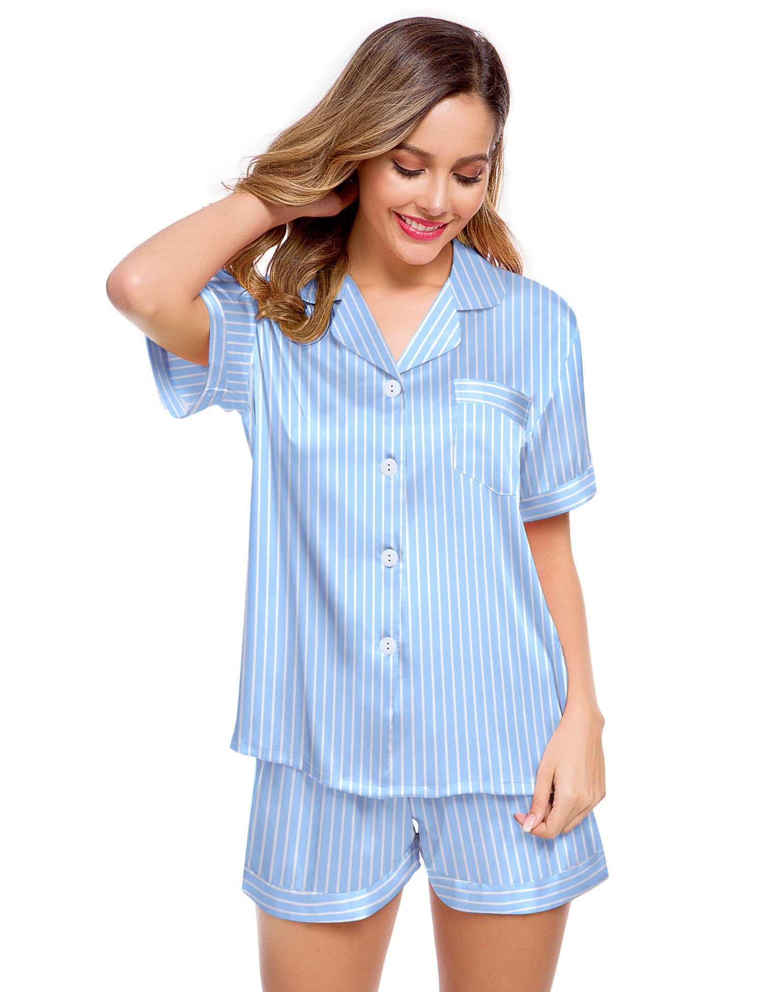 ❤ OCCASIONS: This womens short sleeve silk satin pajamas set is perfect for sleepwear, nightwear, loungwear.The lounge set can be worn as daily pajamas. Suitable for pajama party, girls day, bride wedding. Must have for your bridal party or just daily wear! This silk pajamas for women shorts set is lightweight and easy to carry.