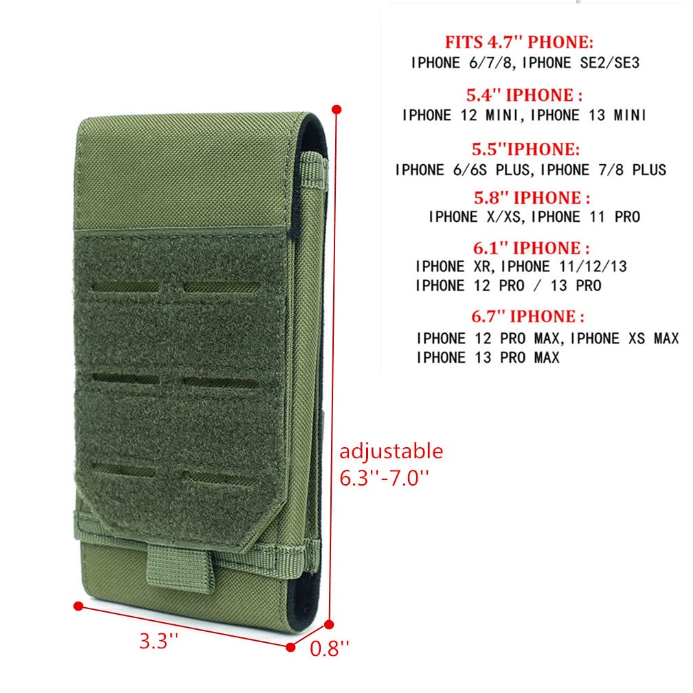 Heyqie Tactical Molle Waist Mobile Phone Waist Bag ➤ Material:1000D Nylon Heavy Duty Fabric and soft fleece material inner lining. lightweight durable, Wear-resistant, Tear-resistant ➤ Color: Black ➤ Size (LWH):6.3*3.3*0.8 inches (Cover adjustable height from 6.3 - 7.0 inches). ➤ Compatible Cellphone Model: Apple iPhone 13 Pro Max,iPhone 13 Pro,iPhone 13,13 Mini,iPhone 12 Pro Max,iPhone 12 Pro,iPhone 12,12 mini,iPhone 11 Pro Max,iPhone 11,11 Pro,iPhone 10,iPhone X,XR,XS,iPhone XS Max,iPhone 8 Plus,8,7 Plus,7 iPhone 6,6s,6s Plus,iPhone SE,SE2,SE3 Samsung galaxy s22/ s21/ s10/ s20 fe 5g/ s20/ s22 plus/ s10 plus/ s10e/s21 fe/s9/s8/ s9 plus/s20 plus/s21 plus/s22+/s7/s6 lite/s8 plus/s10+/s5/s7 edge/S6/s7 plus/S21 Ultra,samsung z flip 3/ Z Fold 3 5G/z fold 2;Samsung galaxy a13 5g/ a12/ a32 5g/ a13 5g/ a52 5g/a02s/a03s/a32/a71 5g/a10e/a42 5g/a20/a51/a21/a72/a53/a50/a52s/a01/a20/a02/a10/a11 /a7/a32/a70;note 20/note 10 plus/note 9 /note 10/note 8/j7. Sony Xperia xperia 1 iii 3 OnePlus Nord N200/9 Pro/8/8T 5G/7 Pro7T/Nord 2/Nord N100 Google Pixel 6/6 pro,5,4a,3,5a,3 XL,2 XL,2,4 XL, Motorola Moto G Stylus 5G,G Pure,G Power (2021) ,G Stylus 2021,G Play 2021 ,E,G Power 2022,G Stylus Case (2020),E6 ,Z4,G7,G200,G7 Plus,Z3,G7 Play, G fast ,Razr 5G,Z3 Play,G9 Power 2021, X4, Huawei Mate 20 Lite/40 Pro 5G/20 Pro /P50 Pro/ P30 Pro/P40 Pro/P30 Lite /P30 Lite /P40/P40 Lite OR other phone models of around 4.7-6.7 inch big screen Also compatible with portable hard disk, external battery and portable device like PSP or NDS Perfect for camping/hiking/other outdoor use, it can hang on the belt, Able it to attached to any molle webbing vest, bag, duty belt or backpack ➤ Qty:1 Pack Tactical Waist Bag + 1 Pack US Flag Patch Please contact us if you have any questions.