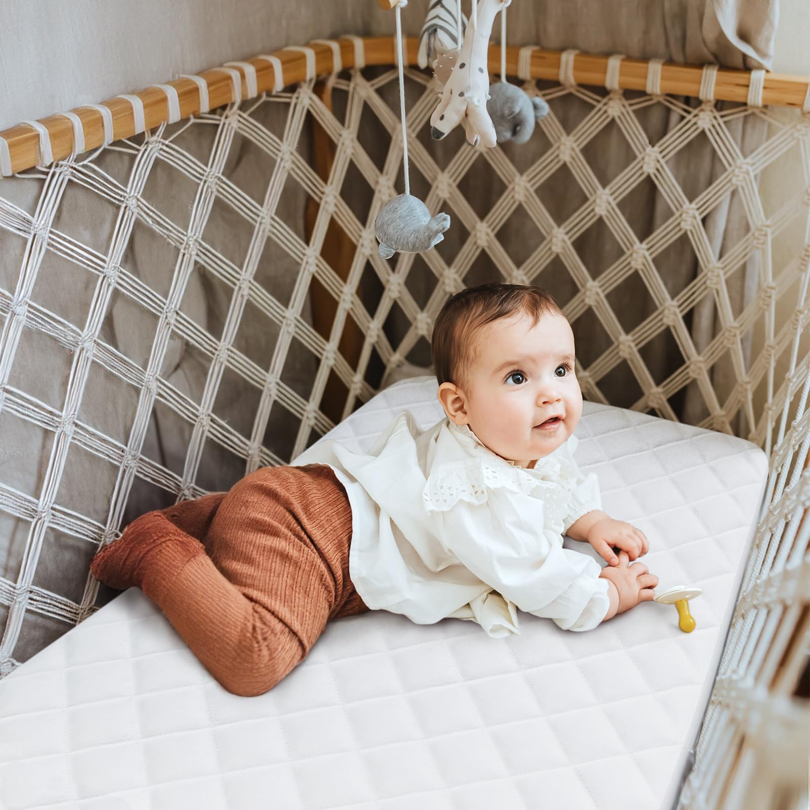 Waterproof and Noiseless: 100% Protection against URINE, MILK, SWEAT and other liquids soaking into the valuable mattress. The Waterproof layer of the bassinet mattress pad is skin friendly which is made of food-grade TPU, and we perfectly control the thickness of membrane that keeps the bassinet mattress protector soft and silent, it remains quiet however your child turns.