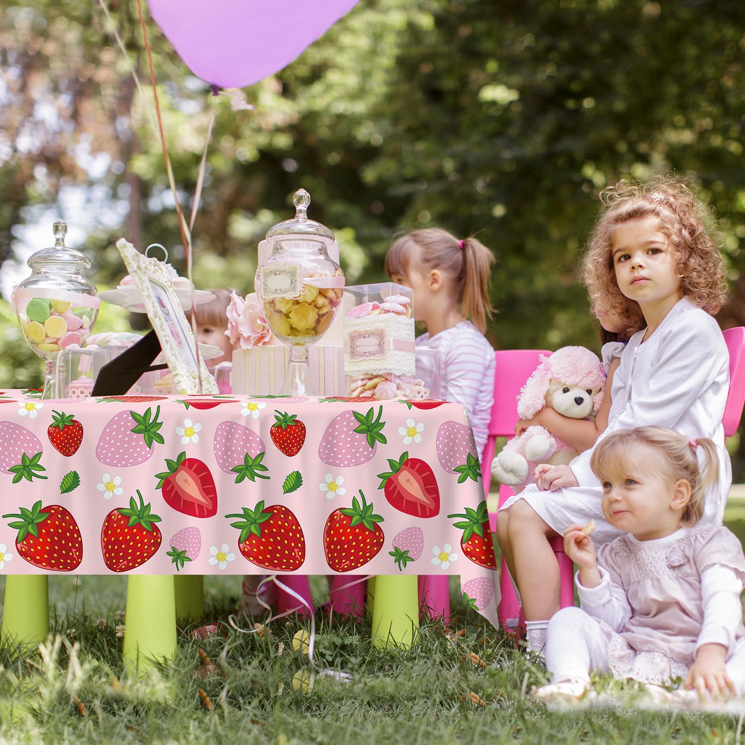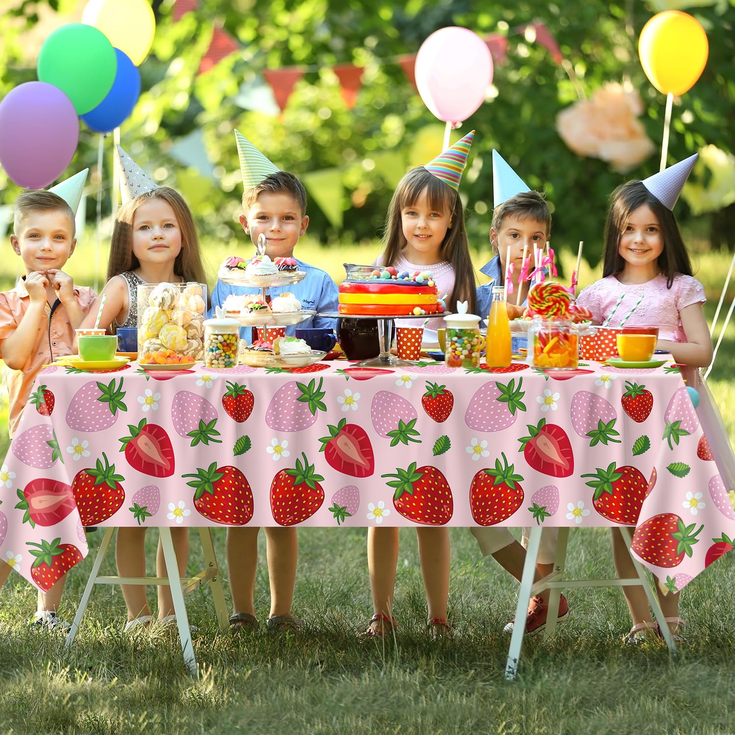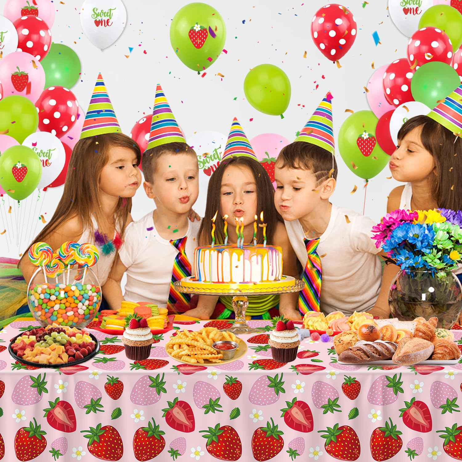 Strawberry Party Tableclothes Set: Package Includes 4 pack of Strawberry party tablecloths, designed with sweet Strawberry, leaves, flowers for sweet strawberry theme party. These strawberry birthday table decorations are so cute and colorful that make your strawberry theme party, sweet one birthday party or summer fruit themed party a big hit.